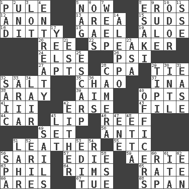 ACROSS 1. Whine 5. Immediately 8. Greek god of love 12. At once, immediately (arch.) 13. Type of rug 15. Beer foam 16. Simple song 18. Highlander 19. Medicinal plant 20. Portuguese money of account (variant) 22. Orator 24. Otherwise 26. Air pressure measure (abbr.) 27. Tenement units (abbr.) 28. Tax preparer (abbr.) 29. Neckwear 32. Table seasoning 35. US Secretary of Labor Elaine L. _ 37. _ tizzy (2 wds.) 38. Like ___ of sunshine 39. Direct toward a target or goal 40. Elects 41. One more than two 42. Celtic language 43. Do some clerical work 44. Auto 45. Mouth edge 46. Coral ridge 49. Put into a specified state 50. Opposed to 51. Cordwainer's material 55. And so on (abbr.) 56. Indian skirt 57. Singer Brickell 59. Nest on high 63. Silvers or Donahue 64. Basketball hoops 65. Pace 66. Ancient Greek god of war 67. Third day of the wk. 68. Connect, as a bridge DOWN 1. Writing tablet 2. Corn or form start 3. Car dealer's back yard 4. Plea 5. Tired old horse 6. Mouths or openings 7. Shed a tear 8. 1973 Nobel Price Winner (Physics) Leo 9. Governing power 10. Scent 11. Compass dir. 14. City in Syria 17. Sharp bark 21. Eastern Standard Time (abbr.) 23. White ___ sheet 25. Fortification 28. Device for capturing images 29. Native american tent (variation) 30. International (abbr.) 31. Relaxation 32. Ketch in the Levant 33. Operatic vocal solo 34. Den 36. Part of HMS, perhaps 40. Persons of authority 42. One or the other of two 45. Allow 47. Compass dir. 48. Singer James 49. Travels by water 51. Cowardly lion portrayer 52. 4th largest of the Great Lakes 53. Prepare for publication 54. Tall New Zealand timber tree 56. Health resort 58. Compass dir. 60. Hit sharply and swiftly 61. Call ___ day 62. Car or cant ending