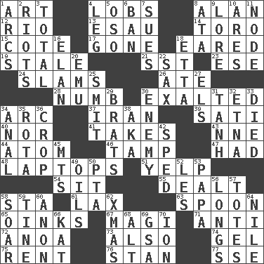 ACROSS 1. Nonscientific branch of learning 4. Tennis shots 8. Actor Alda or Thicke 12. _ de Janeiro 13. He sold his birthright 14. "Corrida" creature 15. ____ d'Azur (French Riviera) 17. Went 18. Having ears or earlike features 19. Lacking originality or spontaneity 21. Fast jet (abbr.) 23. Compass dir. 24. Hits or strikes with great force 26. Had dinner 28. Unfeeling 30. Glorified 34. Curve 37. SW Asia republic 39. Suttee (variant) 40. Not either 41. Receives possession of 43. Compass dir. 44. Tiny particle 46. Pack (down) 47. Possessed 48. Portable computers 51. Sharp bark 54. Be seated 55. Started a card game 58. R.R. building 61. Not strict 63. Soup utensil 65. Pig sounds 67. Wise men 71. Against 72. Small Philippine buffalo 73. In addition 74. Set 75. Monthly bill 76. Comedian Laurel of Laurel & Hardy 77. Compass dir. DOWN 1. Arches 2. Disturbances 3. "_____ Recall" 4. Part of a journey 5. Bear (Spanish) 6. Prohibit 7. Institutes legal proceedings 8. "One Day ___ Time" 9. Old wives' tales, e.g. 10. Ancient Greek god of war 11. Connecting point 16. Enthusiasm 18. Singer James 20. Australian flightless bird 22. Saxophone 25. Stricken, poetically 27. Raised railways 29. Naughty children 30. Foe 31. Hyperbolic tangent 32. Inactive volcano in Sicily 33. Passed on 34. Of or related to the anus 35. Roll call or roster of names 36. Riding implement 38. Alias (abbr.) 42. Moved rapidly 45. Mountains (abbr.) 49. Petroleums 50. Parent Teacher Assoc. 52. French article 53. Dad 56. Yearns 57. Hauls 58. Fly high 59. Prong on a fork 60. Soon (poet.) 62. Dec. holiday 64. The longest river in the world 66. Krazy ___ of comics 68. Keyboard modifier key 69. Girls' org. (abbr.) 70. Electrically charged atom