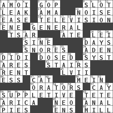 ACROSS 1. Mine, in Marseilles 5. Republican Party 8. Narrow, elongated depression 12. Path through which fluid escapes 13. Housemaid (var.) 14. Annoying sound 15. Comfort 16. Household entertainment appliance 19. Compass dir. 20. Commissioned military rank 21. Russian ruler of old 23. Had dinner 24. Flowery wreath 27. Trig term 30. 24-hour periods 31. Sounds asleep 34. Arabian gulf 35. "You Light Up My Life" star Conn 38. Administered medicine 40. System (abbr.) 41. Ancient Greek god of war 42. Flight of steps 44. Monthly bill 45. 57 in ancient Rome 46. Double-curved letter 47. Feline 50. Count _ (2 wds.) 53. Speakers 57. Island 59. Supplementary 63. Wig 64. N. Chile seaport 65. Modern: prefix 66. Of or related to the anus 67. Sliced desserts 68. Followers of ems 69. Place where flour is made DOWN 1. Toward shelter 2. Intended 3. Fertile tracts in a desert 4. D.D.E's nickname 5. Yard entry 6. Sign of something about to happen 7. Diluted with white 8. Mayday 9. Cards in a Roman deck? 10. Bear (Spanish) 11. "___ Little Indians" 14. "Death on the ____" 17. Period 18. Large container 20. Amused look 22. Help 24. Kenny Rogers chart-topper in '80 25. Snake ____ (dice throw) 26. Is not 28. Dreamland 29. Greek god of love 30. Hyrax 32. Eastern Standard Time (abbr.) 33. Lick closed 35. Have the gumption 36. Angers 37. Habitations of wild animals 39. HTML Container Element 43. Basketball hoops 47. Root beer relative 48. "We ___ not amused" (Victoria) 49. Make lace 51. Ancient Celtic tribe of eastern Britain 52. Relating to or accompanying birth 54. Prong on a fork 55. Baking chamber 56. Vintage cars 58. Shout 59. Plant excrement 60. RI univ. 61. Sliced dessert 62. Personal Computers (abbr.) 63. Scottish cap