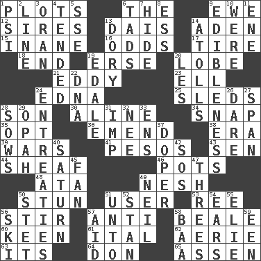 ACROSS 1. Ground plans 6. Definite Article 9. She-sheep 12. Begets 13. Raised platform 14. Arabian gulf 15. Lacking in sense or substance 16. Probability 17. Hoop that covers a wheel 18. Conclusion 19. Celtic language 20. Ear part 21. Whirlpool 23. Pipe bend 24. Pulitzer Prize-winning author Ferber 25. Bobsleighs 28. Male child 30. Place in a line 34. Fastener 35. Choose 36. Make improvements or corrections to 38. Period 39. Armed conflicts 41. Mexican monetary units 43. Elected rep. 44. To gather and bind into a bundle 46. Cooking vessels 48. "One Day ___ Time" 49. Tender 50. Astound 51. One who makes use of a thing 53. To separate or throw off 56. Use a swizzle stick 57. Against 58. Memphis, Tenn. Street 60. Peachy ____! 61. Slanted text style (abbr.) 62. Nest on high 63. ___ a Wonderful Life 64. Spanish title 65. NE Netherlands city DOWN 1. 23rd letter of the Greek alphabet 2. Actor's bit 3. NW Algerian seaport 4. Looked after 5. Compass dir. 6. Small boys 7. Flintstone garb 8. Double-curved letter 9. The property of being fit to eat 10. Past tense of be (plural) 11. Compass dir. 13. Small, narrow, flatbottom fishing boat 14. Ringlike coral islands and reefs 19. Peak District village in England 20. French article 22. Heredity factor (abbr.) 24. Pleas 26. Have the gumption 27. Connect, as a bridge 28. Sty mamas 29. Brightly colored fish 31. Naughty child 32. Born 33. Followers of ems 37. Drug addict 40. Titan orbits this 42. Distress signal 45. Air blower 47. Trios 49. Famous astronaut Armstrong 50. Proofreading order 51. To (old English) 52. Comedian Laurel of Laurel & Hardy 54. Hearing organs 55. Writer Wiesel 56. What Jean-Claude Killy likes to do 57. Help 58. Sound made by sheep 59. Car or cant ending