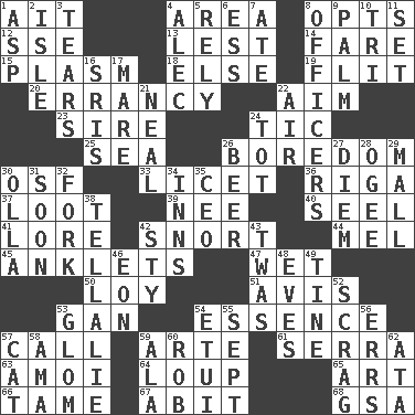 ACROSS 1. Small island 4. Type of rug 8. Elects 12. Compass dir. 13. For fear that 14. Conductor's collection 15. Suffix with ecto or cyto 18. Otherwise 19. Sudden quick movement 20. The state or an instance of erring 22. Direct toward a target or goal 23. Beget 24. Nervous spasm 25. Ocean 26. Mood resulting from idleness 30. Order of Saint Francis (abbr.) 33. It is permitted: Lat. 36. Capital of Latvia 37. Spoils 39. Born 40. Stitch closed the eyes of (a falcon) 41. Old wives' tales, e.g. 42. Derisive sound 44. Cartoonist voice _ Blanc 45. Short socks 47. Soggy 50. Myrna of the movies 51. Deliberation 53. Separate the seeds from cotton 54. Gist 57. Give a ring to 59. Johnson of "Laugh-In" 61. Father Junipero _ 63. Mine, in Marseilles 64. Central Nebraska county 65. Nonscientific branch of learning 66. Docile 67. "This won't hurt ____!" 68. Girls' org. (abbr.) DOWN 1. Cleo's killer 2. Capri or Wight 3. Pulls apart 4. Actor Baldwin 5. Depend 6. Curvy letter 7. Had dinner 8. Persons of authority 9. Inside of hand 10. Three (prefix) 11. Arrange properly for use 16. Indian titles of respect 17. Female horse 21. Anneal 22. Atmosphere 24. Small child 26. Fermented drink made from hops 27. South Vietnam president (1954) 28. Double curve, resembling the letter S 29. Promenade 30. Water jar 31. Within a short period 32. Tined utensil 34. Taverns 35. Corporate head (abbr.) 38. Copy Pinocchio 42. Filthy place 43. It was, poetically 46. Period of immesurable duration 48. Nights before holidays 49. Prong on a fork 52. Strangle with an iron collar 53. Seize upon or latch onto something 54. Needle holder 55. Back-to-school mo. 56. Blunders 57. Domesticated feline 58. Nursemaid (var.) 59. Chicken ___ king 60. Director Reiner 62. _ moment's notice (2 wds.)