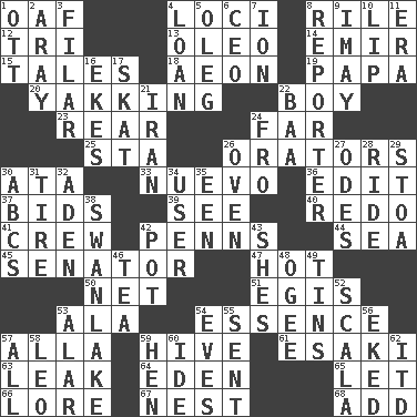 ACROSS 1. Clumsy lout 4. Venues 8. Cause heat under the collar 12. Three (prefix) 13. Butter sub 14. Arab leader 15. Lies 18. A really long time 19. Dad 20. Talking persistently and meaninglessly 22. Male child 23. Bring up, as a child 24. Distant 25. R.R. building 26. Speakers 30. _ moment's notice (2 wds.) 33. New (sp.) 36. Prepare for publication 37. Auction offers 39. Observe 40. Redecorate 41. Ship's personnel 42. Actor Sean's family 44. Ocean 45. Legislator 47. Being at a high temperature 50. Fish or hair follower 51. The front part of a cuirass 53. According to 54. Gist 57. Silent film actress Nazimova 59. Hub of activity 61. 1973 Nobel Price Winner (Physics) Leo 63. Path through which fluid escapes 64. Genesis locale 65. Allow 66. Old wives' tales, e.g. 67. A home for chicks 68. Increase DOWN 1. Baseball player Mel 2. Like ___ of sunshine 3. Having threads 4. Grant temporary use of 5. Cassini of fashion 6. Corporate head (abbr.) 7. Electrically charged atom 8. News announcer 9. "If ____ say so..." 10. Mouth edge 11. Epoch 16. Supplements with great effort 17. Three-handed card game 21. SW Asia republic 22. Sound made by sheep 24. Away 26. Baking chamber 27. Lyric poems 28. Travel on an animal 29. Portico 30. Lettered men learn these first 31. Become fatigued 32. An important port of Yemen 34. One who makes use of a thing 35. Car or cant ending 38. Tchaikovsky ballet 42. Plant holder 43. "______ My Girl" (Turtles hit) 46. Afternoon social gathering 48. Double curve, resembling the letter S 49. Canisters 52. Any of the three canals of the cochlea 53. Having or resembling wings 54. Nights before holidays 55. Posted 56. Supplemented with great effort 57. 100% 58. Lion 59. Layer 60. Binary compound 62. It would