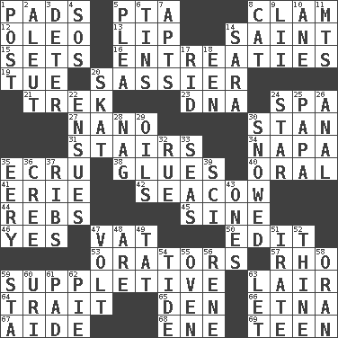ACROSS 1. Groovy apts. 5. Parent Teacher Association (abbr.) 8. Dollar (slang) 12. Butter sub 13. Mouth edge 14. Virtuous person 15. Arranges properly for use 16. Pleas 19. Third day of the wk. 20. More lively and spirited 21. Long journey 23. Heredity factor (abbr.) 24. Health resort 27. Billionth: prefix 30. Comedian Laurel of Laurel & Hardy 31. Flight of steps 34. California wine valley 35. Shade of tan 38. Adhesives 40. Of the mouth 41. One of the Great Lakes 42. Manatee 44. Confederate soldiers (slang) 45. Trig term 46. It is so 47. Large container 50. Prepare for publication 53. Speakers 57. 17th letter of the Greek alphabet 59. Supplying deficiencies 63. Den 64. Distinguishing feature 65. Lair 66. Inactive volcano in Sicily 67. Assistant 68. Compass dir. 69. Adolescent DOWN 1. Mail 2. Native American of Southwest Alaska 3. Prevent from occurring 4. Mayday 5. Entreaty 6. Airtight sealed metal containers 7. Flats, for short 8. Domesticated feline 9. Cards in a Roman deck? 10. One (Scot) 11. Mountains (abbr.) 14. "Two Mules for Sister ____" 17. To free from 18. Car or cant ending 20. Three-handed card game 22. Takes place subsequently 24. Play the lead 25. Dad 26. Of or related to the anus 28. Tired old horse 29. Lubricates 30. Overwhelmed 32. Regret 33. Oceans 35. Suggestive of the supernatural 36. Algonquian 37. Teases 39. _-fi 43. Washington bills 47. Electrical Unit 48. "We ___ not amused" (Victoria) 49. Make lace 51. Feeling or showing extreme anger 52. One or ones belonging to thee 54. Periodic rise and fall of the sea level 55. Baking chamber 56. French philosopher Descartes 58. Northwest Algerian city 59. R.R. building 60. RI univ. 61. Writing tablet 62. Sliced dessert 63. Allow