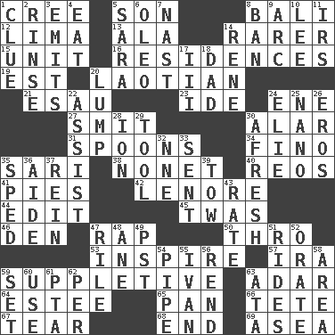 ACROSS 1. Algonquian 5. Male child 8. Indonesian resort city 12. Pale green bean 13. In the manner of 14. Less widely known 15. A single undivided whole 16. Homes 19. Eastern Standard Time (abbr.) 20. Of or relating to Laos or its people 21. He sold his birthright 23. Binary compound 24. Compass dir. 27. Stricken, poetically 30. Having or resembling wings 31. Soup utensils 34. Fine (Spanish) 35. Indian skirt 38. Music written for nine 40. Vintage cars 41. Sliced desserts 42. Poe poem 44. Prepare for publication 45. It was, poetically 46. Lair 47. Reproach for some lapse or misdeed 50. Through, poetically 53. Heighten or intensify 57. Lyricist Gershwin 59. Supplementary 63. The sixth month of the Jewish calendar 64. First name in cosmetics 65. Baking dish 66. False hair 67. Pull apart 68. Conclusion 69. Toward the sea DOWN 1. A slight indication 2. Remove soap 3. Sends forth 4. Consume 5. "Two Mules for Sister ____" 6. Margarine 7. Political cartoonist Thomas 8. Prohibit 9. Curve 10. Area sheltered from the wind 11. Big collection agency 14. French philosopher Descartes 17. One more than two 18. June honoree 20. Mass 22. Help 24. Writer Wiesel 25. Billionth: prefix 26. Greek god of love 28. Electrically charged atom 29. Instrument 30. Anew 32. Compass dir. 33. Emitted 35. Broke a traffic law 36. Helper 37. It's straight from the horse's mouth 39. Pull behind 43. Pace 47. Cause heat under the collar 48. A saturated hydrocarbon 49. Pacific Standard Time (abbr.) 51. Amusement-park features 52. Speak pompously 54. Corncob 55. "Terrible" tsar 56. Tear apart 58. Length times width 59. Arrange properly for use 60. Purpose 61. Parent Teacher Association (abbr.) 62. For each 63. "One Day ___ Time"