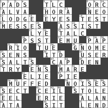 ACROSS 1. Writing tablets 5. Affectionate concern, for short 8. The grampus (Milton) 11. Inventor's middle name 12. Israeli folk dance 14. Modern: prefix 15. Inn 17. Sight organs 18. Trial 19. Makes clutter 21. Help 23. Potassium hydroxide 25. Baby powder 26. Inconspicuous attention getter 27. Australian flightless bird 28. Infant food 31. River (Sp.) 33. Third day of the wk. 35. Dwarf 37. Elected reps. 38. It would 40. One who makes use of a thing 41. Table seasonings 43. Head covering 45. Lair 46. Attempt 47. Followers of ems 50. Female horse 52. Writer Wiesel 53. Sliced dessert 54. Bungled 56. Annoying sounds 61. Religious group 62. To provide with a ceiling 65. Fur scarf 66. Snakelike fish 67. One of the Great Lakes 68. Actor Alda or Thicke 69. "One Day ___ Time" 70. Be seated 71. Grant temporary use of DOWN 1. Inside of hand 2. _ vera 3. Movie discs 4. Sinks 5. Definite Article 6. Myrna of the movies 7. Cause to be 8. Washington bills 9. State of inaction 10. Small bed 13. Indian state 16. Snakelike fish 18. Nervous spasm 20. System (abbr.) 22. Strike heavily 24. Needle holder 26. Mail 28. Introduce or present, as a question 29. So be it 30. For each 31. Bring up, as a child 32. Inwardly 34. And so on (abbr.) 36. Unadorned 37. Fast jet (abbr.) 39. Moist 42. Oneself 44. Ache 48. Sibling's daughter 49. Spring feasts 51. Vintage cars 52. Newt 54. Confront 55. Southern CA. univ. 57. Slanted text style (abbr.) 58. Flatfish 59. Flair 60. Post 61. Ocean 63. One more than two 64. Allow