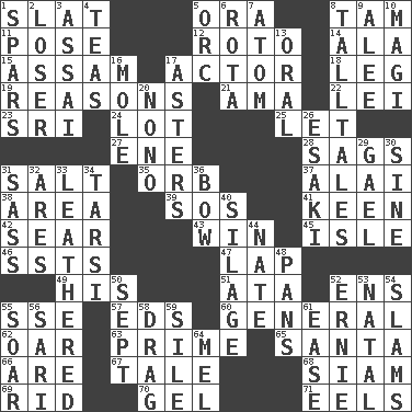 ACROSS 1. Narrow board 5. Mouth or opening 8. Scottish cap 11. Airs 12. Printing process, for short 14. According to 15. Indian state 17. Thespian 18. Part of a journey 19. Thinks logically 21. Nursemaid (var.) 22. Luau accessory 23. Indian title of respect (Mr.) 24. Car dealer's back yard 25. Allow 27. Compass dir. 28. Sinks 31. Table seasoning 35. Globe 37. Mountain range southwest of Kyrgyzstan 38. Length times width 39. Distress signal 41. Peachy ____! 42. Singe 43. Acquire through effort 45. Capri or Wight 46. Fast planes 47. Infant locale 49. Part of HMS, perhaps 51. _ moment's notice (2 wds.) 52. Followers of ems 55. Compass dir. 57. Begley and Asner 60. Commissioned military rank 62. Boat paddle 63. A-one 65. Before Barbara or Clara 66. "We ___ not amused" (Victoria) 67. Falsehood 68. Thailand, formerly 69. To free from 70. Set 71. Snakelike fish DOWN 1. Practice fights 2. Failure 3. Slender Brazilian palm 4. Afternoon social gatherings 5. The grampus (Milton) 6. Roll call or roster of names 7. Tiny particle 8. Baron Munchausen's specialties 9. Toward shelter 10. Wise men 13. Relating to the mouth 16. Undercover agent 17. Michaelmas daisies 20. Words to Nanette 26. 1973 Nobel Price Winner (Physics) Leo 29. Highlander 30. Trig term 31. Backtalk 32. Ancient Greek god of war 33. Resembling or made to resemble leather 34. Tarsus (plural) 36. Ribbon knot 40. Fodder prepared in a silo 44. Nathan's nickname 48. Zero-star reviews 50. Back-to-school mo. 52. Bert's buddy 53. Brizilian seaport 54. Hits or strikes with great force 55. Fly high 56. Indian skirt 58. To be drawn or hauled along 59. Drop; flow; fall 61. Relaxation 64. Cartoonist voice _ Blanc
