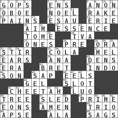 ACROSS 1. Republicans 5. Followers of ems 8. At once, immediately (arch.) 12. Mitch Miller's instrument 13. Christmas carol 15. Libertine 16. Aches 18. He sold his birthright 19. One of the Great Lakes 20. Direct toward a target or goal 22. Gist 24. Heavy book 26. Federal power corp. 27. Singles 28. Before (prefix) 29. Mouth or opening 32. Move through with a circular motion 35. Root beer relative 37. Cartoonist voice _ Blanc 38. Hearing organs 39. Santa ___, CA 40. Cub Scout units 41. Epoch 42. Cy Young winner Saberhagen 43. Southeast Asian peninsula 44. Male child 45. Plant excrement 46. Snakelike fish 49. Set 50. Notch 51. Leopard's kin 55. Nilotic language 56. Relationship diagram 57. Downhill vehicle 59. First class 63. Immeasurably long periods of time 64. So be it 65. Musical group of three 66. Domed church section 67. In the manner of 68. Droops DOWN 1. Republican Party 2. Chief or king in Benin or Nigeria 3. Luau course 4. Legislators 5. Compass dir. 6. Characteristic smell of wine 7. Oceans 8. Sports stadium 9. Drug cop 10. Migrant worker of the '30s 11. Born 14. A period of five years 17. The Jewish people; Israel 21. Madame (abbr.) 23. Night before a holiday 25. Fortification 28. Food holders 29. Presage 30. Tear apart 31. In addition 32. Observes 33. Pacific island yam 34. SW Asia republic 36. Single 40. What propaganda does 42. Greek mezzo-soprano Agnes 45. Observe 47. Pipe bend 48. Central Nebraska county 49. Honkers 51. Riding implement 52. Coop moms 53. _ mater 54. Person who is morally reprehensible 56. Beverage made from leaves 58. Heredity factor (abbr.) 60. Retirement account (abbr.) 61. Russian fighter aircraft 62. Greek goddess of the dawn