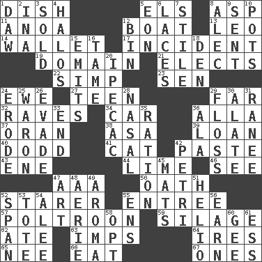 ACROSS 1. Food container 5. Raised railways 8. Cleo's killer 11. Small Philippine buffalo 12. Water vessel 13. Lion 14. Place for singles 17. Happening 19. Realm 21. Opts 22. Simple or foolish person 23. Elected rep. 24. She-sheep 27. Adolescent 29. At a great distance 32. All-night dance parties 34. Automobile 36. Silent film actress Nazimova 37. NW Algerian seaport 38. White ___ sheet 39. Grant temporary use of 40. Texas town _ City 41. Feline 42. Thick mixture 43. Compass dir. 44. Citrus frut 46. Perceive with the eye 47. American Automobile Association (abbr.) 50. Pledge 52. A viewer who gazes fixedly 55. Main course 57. Characterized by complete cowardliness 59. Fodder prepared in a silo 62. Had dinner 63. Naughty children 64. Angers 65. Born 66. Consume 67. Washington bills DOWN 1. Fool 2. _ tizzy (2 wds.) 3. Exchanged or delivered for money 4. Radiant circles of light 5. A really long time 6. Shoestrings 7. Vertical member of a panel or frame 8. Actor Baldwin 9. Emitted 10. Cooking vessels 12. Storage container 15. Gives off 16. Docile 18. Lair 20. Medicinal drug used to evoke vomiting 24. Wear away 25. Make _____ (do battle with) 26. Elude 28. Rhinal 29. Soft thread for cleaning between teeth 30. Having winglike extensions 31. The wife of a rajah (variant) 33. Conclusion 35. Food allowance for one day 36. In the manner of 42. _ dish (used to culture cells) 45. Floor coverings 47. Tate display 48. Nest on high 49. Odor 51. Sun: prefix 52. Connect, as a bridge 53. Carry 54. Toward shelter 55. Followers of ems 56. Merit 58. Elect 60. Unit of force equal to gravity 61. Double-curved letter