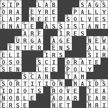 ACROSS 1. Small drink 4. Experiment locale 7. Droops 11. Mouth or opening 12. Jane of fiction 13. Chummy 14. Pet locale 15. Confront 16. Finds the solution 17. Maternal 19. Aide 21. Sandy's bark 23. Angers 24. Capital and largest city of Mongolia 25. Personal question 26. ___ Haven, CT 29. Keyboard key 30. Followers of ems 31. According to 32. Connecticut Ivy Leaguer 33. Big collection agency 34. Title for a knight 35. Bear (Spanish) 36. _-fi 37. Declaim 40. Elected rep. 41. Area sheltered from the wind 42. Many (prefix) 43. Glance over 45. Scottish cap 46. Determination 51. Women servants 55. Foolish or stupid persons 56. Be footloose 58. Beverage made from leaves 59. Having high moral qualities 60. The sixth month of the Jewish calendar 61. Hearing organ 62. Celtic language 63. Fish or hair follower 64. Medical imaging device (abbr.) DOWN 1. Flatfish 2. SW Asia republic 3. Dad 4. Potassium hydroxide 5. Type of rug 6. Stakes 7. Table seasonings 8. Inventor's middle name 9. Small, secluded valley 10. System (abbr.) 12. Develop 13. Introduce or present, as a question 16. Founders of families 18. Small pie 20. Public displays of written messages 22. At a great distance 24. The state of being joined or united 25. Nest on high 26. Thoroughly unpleasant 27. Writer Wiesel 28. Armed conflict 29. Otherwise 32. Greek goddess of the dawn 33. Ancient Celtic tribe of eastern Britain 36. Narrow boards 37. Elect 38. Wanderer 39. _ mater 43. Fur scarf 44. Quote 46. Trig term 47. Scent 48. Teases 49. Northwest Algerian city 50. Connecting point 52. A whole individual unit 53. Letter starter 54. Indian skirt 57. Large container