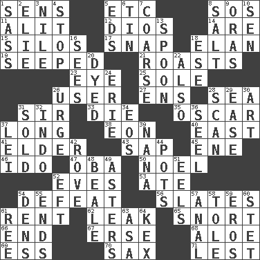 ACROSS 1. Elected reps. 5. And so on (abbr.) 8. Mayday 11. Set down 12. "Vaya con ____" 14. "We ___ not amused" (Victoria) 15. Grain storage towers 17. Fastener 18. Enthusiasm 19. Oozed 21. Exposes to great heat 23. Sight organ 25. Flatfish 26. One who uses or employs something 27. Followers of ems 28. Ocean 31. Title for a knight 33. Expire 35. Witty Wilde 37. Having great length 38. A really long time 40. 90 degrees 41. A person who is older than you are 43. Plant excrement 45. Compass dir. 46. Wedding promise 47. Chief or king in Benin or Nigeria 50. Christmas carol 52. Nights before holidays 53. Had dinner 54. Outscore 56. Chalkboards 61. Monthly bill 62. Path through which fluid escapes 65. Derisive sound 66. Conclusion 67. Celtic language 68. _ vera 69. Double-curved letter 70. Saxophone 71. For fear that DOWN 1. Backtalk 2. Writer Wiesel 3. The longest river in the world 4. Obstruct or block passage 5. Begley and Asner 6. Shallow baking pan 7. Unrefined 8. Table seasoning 9. Mouths or openings 10. Elected rep. 13. Soup utensil 16. Perceives with the eye 18. Compass dir. 20. Colored 22. In addition 24. One of the Great Lakes 26. Goad 28. Glance over 29. Comfort 30. Tate display 31. Exchanged or delivered for money 32. Southeast Asian peninsula 34. Greek goddess of the dawn 36. Sew up the eyelids of hawks and falcons 37. Flowery wreath 39. Nanny 42. Be footloose 44. Plant holders 48. Memphis, Tenn. Street 49. Michaelmas daisies 51. Snakelike fish 52. Bank Draft (abbr.) 54. Habitations of wild animals 55. Conclusions 57. Of or related to the anus 58. Lacquered or enameled metalware 59. Greek god of love 60. Proofreading order 61. To riddle 63. White ___ sheet 64. Dry husk or covering