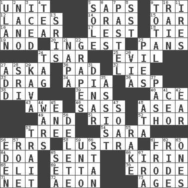 ACROSS 1. A single undivided whole 5. Plant excrements 9. Three (prefix) 12. Shoestrings 14. Mouths or openings 15. Rowing implement 16. Approach 17. For fear that 18. Make a knot 19. Lower and raise head in agreement 20. Swallow 23. Baking dishes 24. Russian ruler of old 25. Morally bad or wrong 27. "____ silly question..." 30. Groovy apt. 32. Whopper 33. To be drawn or hauled along 34. Capital of Western Samoa 36. Viper 38. HTML Container Element 39. Followers of ems 40. Adept person 43. Deep reverence 46. Backtalk 48. At sea 49. Plus 51. _ de Janeiro 52. Son of Odin 53. Woody plant 54. "Two Mules for Sister ____" 56. Blunders 58. A period of five years 61. Back 64. ___ good deed 65. Posted 66. Japanese brewing company 68. Biblical high priest 69. Singer James 70. Eat (away) 71. Remaining after all deductions 72. Period of immesurable duration 73. Eons DOWN 1. ____ Bator 2. Billionth: prefix 3. On the rocks 4. Beverage made from leaves 5. Flatfish 6. Ancient Greek god of war 7. Soft color 8. Fast jet (abbr.) 9. "_____ Recall" 10. Precipitation 11. Angers 13. Indian titles of respect 21. California wine valley 22. Wine fruits 23. Sliced desserts 24. Label 26. By way of 27. Find the sum of 28. Indian title of respect (Mr.) 29. Polynesian shrub of the pepper family 31. Middle Eastern gold or silver currency 35. Help 37. Romantic infatuation 41. Corporate head (abbr.) 42. Ewer handle 44. Armed conflicts 45. Compass dir. 47. Fly high 48. "One Day ___ Time" 50. Keyboard key 53. Distinguishing feature 55. Libertine 56. Genesis locale 57. Hero or heavy, e.g. 59. To (old English) 60. Comedian Laurel of Laurel & Hardy 61. Toadlike animal 62. Travel on or in a vehicle 63. Washington bills 65. Ocean 67. Retirement account (abbr.)