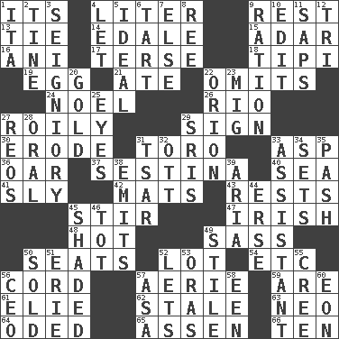ACROSS 1. It is 4. 61 cubic inches 9. Take ten 13. Neckwear 14. Peak District village in England 15. The sixth month of the Jewish calendar 16. Black tropical American cuckoo 17. Laconic 18. Native american tent (variation) 19. Ovum 21. Had dinner 22. Leaves out 24. Christmas carol 26. _ de Janeiro 27. Agitated, as a liquid 29. Public display of a written message 30. Eat (away) 31. "Corrida" creature 33. Cleo's killer 36. Rowing implement 37. French poetic form 40. Ocean 41. Mischievous 42. Floor protectors 43. Musical pauses 45. Tumult 47. From or relating to Ireland 48. Being at a high temperature 49. Backtalk 50. Theater features 52. Car dealer's back yard 54. And so on (abbr.) 56. Drawstring 57. Nest on high 59. "We ___ not amused" (Victoria) 61. Writer Wiesel 62. Lacking originality or spontaneity 63. Modern: prefix 64. Wrote a lyric poem 65. NE Netherlands city 66. "___ Little Indians" DOWN 1. Call ___ day 2. Prong on a fork 3. Signiory (variant) 4. Allow 5. Standard of perfection 6. Small pie 7. Otherwise 8. To separate or throw off 9. Food allowance for one day 10. Prepare for publication 11. Plant excrements 12. Three (prefix) 20. Precious metal 22. Greek mythologigal hunter 23. Russian fighter aircraft 25. Snake ____ (dice throw) 27. Vintage cars 28. Of the mouth 29. Indian titles of respect 31. Russian ruler of old 32. Baseball player Mel 33. Aide 34. Arranges properly for use 35. Romantic infatuation 38. Sends forth 39. Operatic vocal solo 44. Celtic language 45. Cast a shadow over 46. Small child 49. Vertical member of a panel or frame 50. Exchanged or delivered for money 51. One of the Great Lakes 52. Allows 53. Mouths or openings 55. Algonquian 56. Corporate head (abbr.) 57. White ___ sheet 58. Car or cant ending 60. Period of immesurable duration