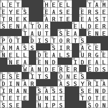 ACROSS 1. Allow 4. Person who is morally reprehensible 8. Scottish cap 11. Sight organs 13. Relaxation 14. Celtic language 15. Long journey 16. Johnson of "Laugh-In" 17. Compass direction 18. Legislator 21. A person who is older than you are 22. Strained 23. Ocean 25. Compass dir. 26. Plant holder 29. What propaganda does 32. Collect or gather 34. Title for a knight 35. Adept person 38. 1994 drama film starring Jodie Foster 39. Allots cards 41. Goad 43. Teachers' org. 44. Conclusion 45. Standard of perfection 46. Nomad 50. Begley and Asner 51. Compass dir. 54. It is 55. Singles 57. Middle Eastern gold or silver currency 59. Nineveh was its capital 63. SW Asia republic 64. Backtalk 67. Post 68. False hair 69. A single undivided whole 70. Haul 71. Compass dir. 72. Pinches, bites 73. Boy, to dad DOWN 1. Allows 2. Jane of fiction 3. Adolescent 4. Centers 5. Ewer handle 6. Eastern Standard Time (abbr.) 7. Area sheltered from the wind 8. Buy and sell 9. NE Netherlands city 10. Distance measurement (Brit.) 12. Three-handed card game 14. Snakelike fish 19. Small amounts or degrees 20. Fr. "Yes" 21. Consume 23. Earth 24. Blunders 26. Baking dish 27. Sign of something about to happen 28. Story 30. Sadhe (variant) 31. Saudi Arabian king (1953-1964) 33. Cole _ (cabbage dish) 36. Algonquian 37. Mild oath 39. Gouge 40. Conclusions 42. Raised railways 45. Angers 47. Wind 48. Cooks with dry heat, as in an oven 49. Followers of ems 51. Prepares for publication 52. Male parents of animals 53. Maternal 56. System (abbr.) 58. A saturated hydrocarbon 60. Vintage cars 61. To the inside or interior of 62. Arabian gulf 64. Player for Phoenix 65. Cuckoo 66. Small drink