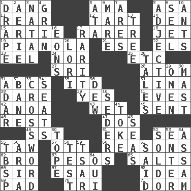 ACROSS 1. Mild oath, euphamism for damn 5. Nursemaid (var.) 8. White ___ sheet 11. Hitchcock's "____ Window" 12. Small pie 14. Lair 15. Nick name for Arthur 17. More valued for its uncommonness 18. _ stream 19. Player piano 21. Compass dir. 22. Raised railways 23. Snakelike fish 24. And not 25. And so on (abbr.) 27. _ Lanka 28. Smallest unit of an element 31. Lettered men learn these first 35. It would 37. Pale green bean 38. Have the gumption 39. It is so 41. Nights before holidays 42. Small Philippine buffalo 43. Dripping 45. Transmitted 46. Take ten 47. Two (Sp.) 49. Fast jet (abbr.) 51. Supplement with great effort 52. Ocean 55. The 23rd letter of the Hebrew alphabet 57. Baseball player Mel 60. Thinks logically 62. Sis' sibling 63. Mexican monetary units 65. Table seasonings 66. Title for a knight 67. Son of Isaac 68. The main thing one is thinking about 69. Groovy apt. 70. Three (prefix) 71. Dormintory (informal) DOWN 1. Window treatment 2. Nest on high 3. Relating to or accompanying birth 4. Smile widely 5. "One Day ___ Time" 6. Female horse 7. Ancient Greek god of war 8. Descriptive word 9. Sew up the eyelids of hawks and falcons 10. Pismires 13. Woody plant 16. Immeasurably long periods of time 17. Noteworthy scarcity 20. Australian parrot (variant) 26. Stories 29. Presage 30. Vertical spar for supporting sails 31. The sixth month of the Jewish calendar 32. Object of repulsion 33. What you're doing now 34. Theater features 36. Morning condensation 40. Spring feasts 44. Casino tip 48. Oceans 50. Drink excessively 52. Twentieth part of a lira 53. Keyboard key 54. Indian state 55. Cook's measure (abbr.) 56. Operatic vocal solo 58. Trial 59. Russian ruler of old 61. Expressed in words 64. Fr. "Yes"