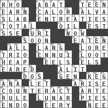 ACROSS 1. 17th letter of the Greek alphabet 4. Blind as ____ 8. Adolescent 12. Merit 14. Bodily heat indicating an inflammation 16. Inventor's middle name 17. Thick slice 18. Pleas 20. Add up to 22. Lubricate 23. Eastern Standard Time (abbr.) 24. Compass dir. 25. RI univ. 28. Immediately 30. Within a short period 31. Eroded 35. Everything 37. Austrian-born American filmmaker Fritz 40. Old wives' tales, e.g. 41. Musical group of three 42. World-weariness 44. Spoils 45. Pile 46. Snakelike fish 47. Raised railways 48. Having ears or earlike features 50. Came down and settled, as after flight 52. Two (Sp.) 54. Commissioned mil. rank 55. Cask 58. Santa ___, CA 61. Allow 63. Originate 65. Act in opposition 70. Johnson of "Laugh-In" 71. Governing power 72. Type of eclipse 73. Sliced desserts 74. Inside; within (prefix) 75. Suggestive of the supernatural 76. Born DOWN 1. Musical pauses 2. Auras 3. Speak pompously 4. Adept person 5. Forbid 6. Keyboard modifier key 7. "Corrida" creature 8. Make lace 9. Writer Wiesel 10. Nights before holidays 11. Political cartoonist Thomas 13. Basketball assoc. 15. It's straight from the horse's mouth 19. Medicinal plant 21. Nilotic language 26. Hero or heavy, e.g. 27. Empty; void 29. Place for singles 30. Slanted 32. Utensil 33. Greek god of love 34. Remaining after all deductions 35. Type of rug 36. One who doesn't tell the truth 38. Compass dir. 39. POW camp 41. Definite Article 43. Small island 49. Stupid person 51. _ tizzy (2 wds.) 53. Sew up the eyelids of hawks and falcons 55. Japanese brewing company 56. First name in cosmetics 57. Honkers 58. 1/640 square mile 59. Part of speech 60. Old (Scot.) 62. Loyal 64. Reproach for some lapse or misdeed 66. Modern: prefix 67. One (Scot) 68. Automobile 69. Attempt to accomplish something