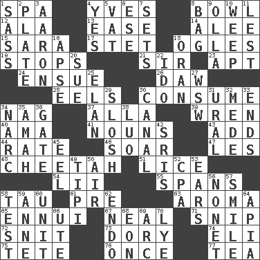 ACROSS 1. Health resort 4. Jacques Cousteau's middle name 8. Soup holder 12. Chicken ___ king 13. Comfort 14. Toward shelter 15. "Two Mules for Sister ____" 17. Proofreading order 18. Stares at amorously 19. Ceases 21. Title for a knight 23. Fitting 24. Follow as a consequence or result 26. Simpleton 28. Snakelike fish 30. Eat 34. Tired old horse 37. Silent film actress Nazimova 39. Songbird 40. Wet nurse (var.) 41. Parts of speech 43. Say or write further 44. Pace 46. Fly high 47. French article 48. Leopard's kin 51. Louse (plural) 54. Cards in a Roman deck? 55. Connects, as a bridge 58. The 19th letter of the Greek alphabet 61. Before (prefix) 63. Odor 65. World-weariness 67. Actress Patricia 71. Clip 72. In a ____ (agitated or irritated) 73. Rowboat 74. Connecticut Ivy Leaguer 75. False hair 76. Single time 77. Beverage made from leaves DOWN 1. Backtalk 2. Food holder 3. Composer Copland 4. Consenting reply 5. Large container 6. Compass dir. 7. Puts into a specified state 8. Paper or plastic container 9. Rounded earthenware pot or jar 10. Shed a tear 11. For fear that 16. Domed church section 18. NW Algerian seaport 20. Institute legal proceedings 22. Wedding promise 25. Enthusiasm 27. Compass dir. 29. Make a splashing sound 30. Lessep's creation 31. Mountain range 32. Ancient Persian 33. Extremities 34. Drug cop 35. Nursemaid 36. Yard entry 38. Nilotic language 42. Indian titles of respect 45. Snakelike fish 49. Native american tent (variation) 50. Wind 52. Tax preparer (abbr.) 53. Hearing organs 56. Music written for nine 57. Grin 58. Trial 59. Singer Murray 60. A single undivided whole 62. Inside; within (prefix) 64. Capital of Western Samoa 66. Shoshoni 68. Period of immesurable duration 69. Curve 70. Potassium hydroxide