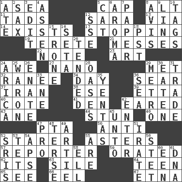ACROSS 1. Toward the sea 5. Head covering 8. The first octave above the treble staff 11. Bits 12. "Two Mules for Sister ____" 13. By way of 14. Is extant 17. Obstructing or blocking passage 19. Cigar-shaped 21. Makes clutter 22. Short letter 23. Nonscientific branch of learning 24. Deep reverence 27. Billionth: prefix 29. Was introduced to 32. The wife of a rajah (variant) 34. 24 hours 36. Dry up 37. SW Asia republic 38. Compass dir. 39. Singer James 40. ____ d'Azur (French Riviera) 41. Lair 42. Having ears or earlike features 43. One (Scot) 44. Astound 46. Single 47. Parent Teacher Association (abbr.) 50. Against 52. A viewer who gazes fixedly 55. Michaelmas daisies 57. Newsperson 59. Declaimed 62. It is 63. Drop; flow; fall 64. Adolescent 65. Perceive with the eye 66. Snakelike fish 67. Inactive volcano in Sicily DOWN 1. Had dinner 2. Saxophone 3. Prepare for publication 4. NE Netherlands city 5. Domesticated feline 6. Scent 7. Some stationery 8. Opinion 9. Actor's bit 10. Labels 12. Compass dir. 15. Marketplace scale 16. Bristle 18. Pacific Standard Time (abbr.) 20. Watched over 24. N. Chile seaport 25. Make _____ (do battle with) 26. Maternal 28. Fertile tracts in a desert 29. Paris' subway 30. Eroded 31. Exchange 33. Compass dir. 35. Gossips 36. Ocean 42. Keyboard key 45. To (old English) 47. Adept person 48. Laconic 49. Nick name for Arthur 51. Feeling or showing extreme anger 52. Indian titles of respect 53. False hair 54. Domed church section 55. "We ___ not amused" (Victoria) 56. Proofreading order 58. Pipe bend 60. Car or cant ending 61. Heredity factor (abbr.)