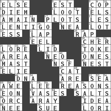 ACROSS 1. Otherwise 5. Eastern Standard Time (abbr.) 8. Police officer (slang) 11. South Vietnam president (1954) 12. Spoils 14. Raised railways 15. At full speed 17. Schemes 18. French article 19. Small, flat, pigmented spot on the skin 21. Teachers' org. 22. Car dealer's back yard 23. Curvy letter 24. Pet locale 25. Hit sharply and swiftly 27. Snakelike fish 28. "Mermaids" star 31. Old wives' tales, e.g. 35. Flaplike covering 37. Casino tip 38. Length times width 39. Modern: prefix 41. Washington bills 42. Vertical spar for supporting sails 43. Science/research agcy. 45. A home for chicks 46. Writer Wiesel 47. Domesticated feline 49. Heredity factor (abbr.) 51. "We ___ not amused" (Victoria) 52. Ocean 55. Deep reverence 57. Area sheltered from the wind 60. Thinks logically 62. A really long time 63. Flower holders 65. Table seasonings 66. The grampus (Milton) 67. Like ___ of sunshine 68. The content of cognition 69. Born 70. Institute legal proceedings 71. Australian parrot (variant) DOWN 1. Peak District village in England 2. Citrus fruits 3. Actors Connery and Penn 4. Send forth 5. Pipe bend 6. Within a short period 7. Carry 8. Portable communications device 9. Butter sub 10. Inconspicuous attention getter 13. Russian ruler of old 16. The longest river in the world 17. Cotton for raincoats, e.g. 20. Highlander 26. NE Massachussets city 29. Makes supply last 30. Take ten 31. Unable to walk 32. Spoken 33. Dwelling 34. Eroded 36. Lair 40. Motion picture awards 44. Conductor's collection 48. Beverages made from leaves 50. Inventor's middle name 52. Twentieth part of a lira 53. Keyboard key 54. Slender Brazilian palm 55. Period of immesurable duration 56. Had on 58. Hearing organs 59. He sold his birthright 61. Move on water 64. Sight organ