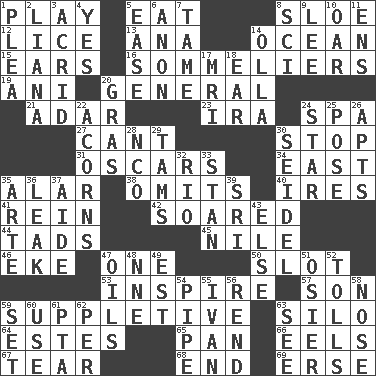 ACROSS 1. Romp 5. Erode 8. A type of plum 12. Louse (plural) 13. Santa ___, CA 14. Sea 15. Hearing organs 16. Wine waiters 19. Cuckoo 20. Commissioned military rank 21. The sixth month of the Jewish calendar 23. Retirement account (abbr.) 24. Health resort 27. Patter 30. Cease 31. Motion picture awards 34. Compass direction 35. Having or resembling wings 38. Leaves out 40. Angers 41. It's straight from the horse's mouth 42. Flew 44. Bits 45. "Death on the ____" 46. Make supply last 47. Single 50. Position in a hierarchy or organization 53. Heighten or intensify 57. Male offspring 59. Supplying deficiencies 63. Grain storage tower 64. _____ Park, CO 65. Baking dish 66. Snakelike fish 67. Pull into pieces 68. Conclusion 69. Celtic language DOWN 1. Entreaty 2. Woody, climbing, usually tropical plant 3. Bitter 4. Consenting reply 5. Relaxation 6. Soon (poet.) 7. Docile 8. _-fi 9. Area sheltered from the wind 10. Boat paddle 11. Followers of ems 14. Water jar 17. Medical imaging device (abbr.) 18. Ewer handle 20. Pate de foie ____ 22. Oak nuts 24. Play the lead 25. Airs 26. Flats, for short 28. Non-commissioned officer (abbr.) 29. Scottish caps 30. A glass for beer 32. River (Sp.) 33. Comedian Laurel of Laurel & Hardy 35. Johnson of "Laugh-In" 36. Path through which fluid escapes 37. Assistant 39. Indian title of respect (Mr.) 43. Otherwise 47. Petroleums 48. Compass dir. 49. Eastern Standard Time (abbr.) 51. Flexible twig of a willow tree 52. For Whom the Bell _____ 54. Corncob 55. _ the terrible 56. Tear apart 58. Sense of smell 59. Put into a specified state 60. Purpose 61. Parent Teacher Association (abbr.) 62. For each 63. Perceive with the eye