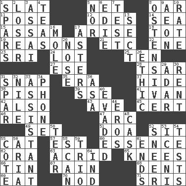 ACROSS 1. Narrow board 5. Fish or hair follower 8. Rowing implement 11. Airs 12. Lyric poems 14. Ocean 15. Indian state 17. Get up 18. Small child 19. Thinks logically 21. And so on (abbr.) 22. Compass dir. 23. Indian title of respect (Mr.) 24. Car dealer's back yard 25. Nine, plus one 27. Compass dir. 28. Russian ruler of old 31. Fastener 35. Epoch 37. Flintstone garb 38. Expression of disdain 39. Compass dir. 41. _ the terrible 42. In addition 43. "___ Maria" 45. Certainty 46. It's straight from the horse's mouth 47. Curve 49. Arrange properly for use 51. ___ good deed 52. Be seated 55. Feline 57. Eastern Standard Time (abbr.) 60. Gist 62. Mouth or opening 63. Bitter 65. Leg joints 66. Metal container 67. Water falling in drops from the sky 68. Undesirable depression on a surface 69. Ingest 70. Lower and raise head in agreement 71. Indian titles of respect DOWN 1. Practice fights 2. Failure 3. Slender Brazilian palm 4. Beverages made from leaves 5. Not either 6. Singer Brickell 7. Trial 8. Clearly or manifestly demonstrative 9. Period of immesurable duration 10. Pace 13. Religious group 16. Undercover agent 17. Michaelmas daisies 20. Olfactory organ 26. Value system 29. The sixth month of the Jewish calendar 30. Monthly bill 31. Coast Guard woman 32. Mediterranean tributary 33. Aide 34. Give a jingle 36. White ___ sheet 40. Dodged 44. Greek god of love 48. Keg 50. Rend 52. Scornful expression 53. Ancient Celtic tribe of eastern Britain 54. Trials 55. ____ d'Azur (French Riviera) 56. Operatic vocal solo 58. Skim 59. Musical group of three 61. Conclusions 64. Indiana (abbr.)