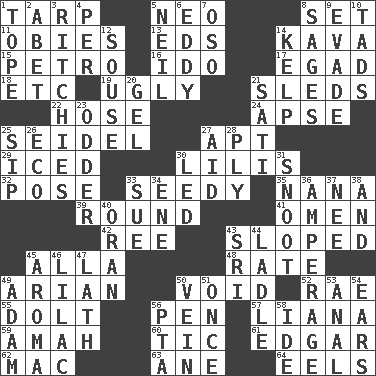 ACROSS 1. Canvas cover 5. Modern: prefix 8. Put into a specified state 11. Off-Broadway awards 13. Begley and Asner 14. Polynesian shrub of the pepper family 15. Stone: prefix 16. Wedding promise 17. Mild oath 18. And so on (abbr.) 19. Repulsive 21. Bobsleighs 22. Flexible conduit 24. Domed church section 25. A glass for beer 27. Fitting 29. On the rocks 30. Ms. Damita and namesakes 32. Introduce or present, as a question 33. Sleazy 35. Grandmother 39. Single shot of ammunition 41. Presage 42. To riddle 43. Inclined 45. Silent film actress Nazimova 48. Assign a rank or rating to 49. Believer in; advocate of (suffix) 50. Null 52. Actress Charlotte 55. Stupid person 56. Fenced enclosure 57. Climbing, woody, usually tropical vines 59. Housemaid 60. Nervous spasm 61. _ Allan Poe 62. Big _ 63. One (Scot) 64. Snakelike fish DOWN 1. Drink excessively 2. Collude with 3. Actors Guy, Robert Welles, and Clint 4. For each 5. Famous astronaut Armstrong 6. Whirlpool 7. Bear (Spanish) 8. Gurus 9. Elude 10. Bits 12. Lush 14. Seaweed 20. Set 21. Suttee (variant) 23. More peculiar 25. Small drink 26. Environmental prefix 27. Assist 28. Strand of rope, yarn or thread 30. Directed 31. Snob 33. Institute legal proceedings 34. Compass dir. 36. Electrical Measurement 37. Born 38. Added to 40. Northwest Algerian city 43. Indian title of respect (Mr.) 44. Dipping utensil 45. Odor 46. Pale purple color 47. Thin strip of wood or metal 49. First man 50. Distinctive style or manner 51. At one time in the past 53. Of or related to the anus 54. Hearing organs 56. Parent Teacher Association (abbr.) 58. Binary compound