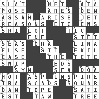 ACROSS 1. Narrow board 5. Was introduced to 8. "One Day ___ Time" 11. Introduce or present, as a question 12. Ancient Greek god of war 14. Lair 15. Indian state 17. Get up 18. Passenger plane 19. Thinks logically 21. And so on (abbr.) 22. Followers of ems 23. Indian title of respect (Mr.) 24. Car dealer's back yard 25. Nervous spasm 27. Compass dir. 28. Proofreading order 31. Oceans 35. Mouth or opening 37. Pale green bean 38. Otherwise 39. Be seated 41. Tending to cause great harm 42. Relaxation 43. Definite Article 45. False hair 46. Clip 47. Begley and Asner 49. Symbol (abbr.) 51. Ocean 52. ___ good deed 55. Being at a high temperature 57. Cleo's killer 60. Heighten or intensify 62. Lyricist Gershwin 63. Tons 65. Echolocation 66. One of the 12 tribes of Israel 67. Drink excessively 68. Suttee (variant) 69. Eastern Standard Time (abbr.) 70. The 23rd letter of the Hebrew alphabet 71. Woody plant DOWN 1. Practice fights 2. Failure 3. Slender Brazilian palm 4. Afternoon social gatherings 5. Third mo. 6. One of the Great Lakes 7. Trial 8. Descriptive word 9. Adolescent 10. Pismires 13. Religious group 16. Undercover agent 17. Michaelmas daisies 20. Words to Nanette 26. Small island 29. Give off 30. Story 31. Observes 32. Enthusiasm 33. Helper 34. Oozy 36. Small island 40. College paper 44. Genesis locale 48. Backtalk 50. Vertical spar for supporting sails 52. Middle Eastern gold or silver currency 53. Speak pompously 54. Nest on high 55. Flintstone garb 56. Mouths or openings 58. Highlander 59. Dad 61. Mail 64. Morning condensation