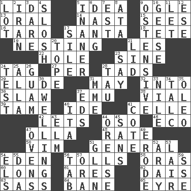 ACROSS 1. Hats (slang) 5. It may be bright or harebrained 9. Stare at amorously 13. Relating to the mouth 14. Political cartoonist Thomas 15. Observes 16. Pacific island yam 17. Before Barbara or Clara 18. False hair 19. Snuggling 21. French article 22. Hollow 23. Trig term 24. Label 27. For each 28. Bits 29. Evade 31. Can I? 32. To the inside or interior of 36. Cole _ (cabbage dish) 37. Australian flightless bird 38. Small bottle 39. Docile 40. Binary compound 41. Cell (Danish) 42. Allows 44. Bear (Spanish) 46. Environmental prefix 47. Rounded earthenware pot or jar 48. Pace 50. Zeal 51. Commissioned military rank 54. Locale of original sin 56. For Whom the Bell _____ 58. Mouths or openings 60. Protracted 61. Ancient Greek god of war 62. Raised platform 63. Backtalk 64. Object of repulsion 65. Jane of fiction DOWN 1. Car dealer's back yard 2. SW Asia republic 3. Have the gumption 4. Agitate, as a liquid 5. More empty; more void 6. Mild oath, euphamism for damn 7. Eastern Standard Time (abbr.) 8. "One Day ___ Time" 9. Clearly or manifestly demonstrative 10. Honkers 11. Allow 12. Compass dir. 17. Filth; sediment 20. Drink excessively 21. Flaplike covering 23. Declare 24. Trial 25. Silent film actress Nazimova 26. Island territory of the United States 28. The 19th letter of the Greek alphabet 30. Homes 31. Madame (abbr.) 33. "Death on the ____" 34. Baby powder 35. Butter sub 37. Begley and Asner 40. Call ___ day 41. ____ d'Azur (French Riviera) 43. Shade tree 44. Threatening words 45. Without 47. Baking chambers 49. Wear away 51. Small, secluded valley 52. Like ___ of sunshine 53. Den 54. Raised railways 55. ___ good deed 56. Keyboard key 57. Mouth or opening 59. Compass dir.