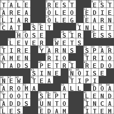 ACROSS 1. Lie 5. Take ten 9. Eastern Standard Time (abbr.) 12. Length times width 13. Butter sub 14. Singer Brickell 15. One who doesn't tell the truth 16. Cassini of fashion 17. Merit 18. Feline 19. Put into a specified state 21. An arm off of a larger body of water 22. Stockings 24. Title for a knight 26. Double-curved letter 27. Prying instrument 28. Soaks 29. Become fatigued 30. Tall tales 32. Coast Guard woman 36. So be it 37. _ de Janeiro 38. Musical group of three 39. Small boys 40. _ dish (used to culture cells) 42. Redecorate 43. Trig term 44. Annoying sound 46. ___ Haven, CT 49. Afternoon social gathering 50. Native american tent (variation) 51. Scent 53. 100% 54. ___ good deed 57. A blast of a horn 58. Back-to-school mo. 61. Grant temporary use of 62. Does sums 63. To (old English) 64. South American Indian 65. French article 66. Dutch treat 67. A whole individual unit DOWN 1. Baby powder 2. Operatic vocal solo 3. Resembling or made to resemble leather 4. Hearing organ 5. Carrot, for example 6. Pipe bend 7. Observe 8. Coat; cloak 9. Peak District village in England 10. Begets 11. Portable shelters 14. Car or cant ending 19. Compass dir. 20. Suggestive of the supernatural 21. Big collection agency 23. Baking chambers 24. Sir (Sp.) 25. It is 27. Pale green bean 28. Compose 29. Make lace 31. Sports stadium 32. Empty completely 33. Elected leader of a country 34. Helper 35. Friend of Pooh 40. Sliced dessert 41. International (abbr.) 43. R.R. building 45. Petroleum 46. Relating to or accompanying birth 47. Wear away 48. Forest 52. Mountains (abbr.) 53. Tiny particle 55. Single time 56. First of billions? 58. Institute legal proceedings 59. Conclude 60. Parent Teacher Assoc. 61. Cards in a Roman deck?