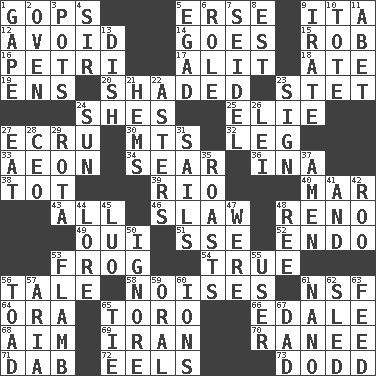 ACROSS 1. Republicans 5. Celtic language 9. Call ___ day 12. Shun 14. Travels 15. Director Reiner 16. _ dish (used to culture cells) 17. Set down 18. Had dinner 19. Followers of ems 20. Cast a shadow over 23. Proofreading order 24. "______ My Girl" (Turtles hit) 25. Writer Wiesel 27. Shade of tan 30. Mountains (abbr.) 32. Part of a journey 33. A really long time 34. Burn superficially 36. _ tizzy (2 wds.) 38. Small child 39. _ de Janeiro 40. Spoil 43. 100% 46. Cole _ (cabbage dish) 48. Western Nevada city 49. Fr. "Yes" 51. Compass dir. 52. Inside; within (prefix) 53. Toadlike animal 54. Loyal 56. Lie 58. Annoying sounds 61. Overdraft (abbr.) 64. Mouth or opening 65. "Corrida" creature 66. Peak District village in England 68. Direct toward a target or goal 69. SW Asia republic 70. The wife of a rajah (variant) 71. Apply (a substance) by light strokes 72. Snakelike fish 73. Texas town _ City DOWN 1. Open wide 2. Baking chamber 3. Plant holders 4. Title for a knight 5. Mild oath 6. Hero or heavy, e.g. 7. Beer mug 8. Eastern Standard Time (abbr.) 9. Feeling or showing extreme anger 10. Lug 11. Collude with 13. Food container 21. Equivocates 22. Michaelmas daisies 23. Signal 24. Player for Phoenix 26. Luau accessory 27. Erode 28. Corporate head (abbr.) 29. Roll call or roster of names 31. Travels by water 35. Exposes to great heat 37. So be it 41. Added to 42. Friend of Pooh 44. Old wives' tales, e.g. 45. Nilotic language 47. Past tense of be (plural) 48. To riddle 50. Snub 53. Flambe (short form) 55. One who uses or employs something 56. Frog relative 57. Operatic vocal solo 59. Relating to the mouth 60. Charged particles 61. Billionth: prefix 62. Downhill vehicle 63. Nourish 65. Make a knot 67. Male parent