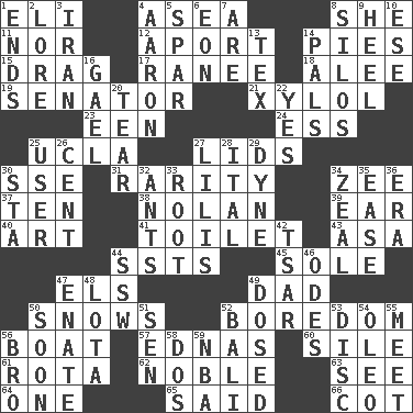 ACROSS 1. Connecticut Ivy Leaguer 4. Toward the sea 8. A female animal or person 11. And not 12. To the left, to Queeg 14. Sliced desserts 15. To be drawn or hauled along 17. The wife of a rajah (variant) 18. Toward shelter 19. Elected representative 21. Xylene (variant) 23. Car or cant ending 24. Double-curved letter 25. Southern CA. univ. 27. Hats (slang) 30. Compass dir. 31. Noteworthy scarcity 34. Last letter of the English alphabet 37. Nine, plus one 38. Pitcher Ryan 39. Hearing organ 40. Nonscientific branch of learning 41. Bathroom plumbing fixture 43. White ___ sheet 44. Fast planes 45. Not divided or shared with others 47. Raised railways 49. Male parent 50. Overwhelms 52. Mood resulting from idleness 56. Water vessel 57. Ferber et al. 60. Filth; sediment 61. Roll call or roster of names 62. Having high moral qualities 63. Observe 64. Single 65. Expressed in words 66. Small bed DOWN 1. Conclusions 2. Old wives' tales, e.g. 3. SW Asia republic 4. Composer Copland 5. Coast Guard woman 6. A really long time 7. "We ___ not amused" (Victoria) 8. Grain storage towers 9. Person who is morally reprehensible 10. Compass dir. 13. John Ritter's dad 14. Friends 16. Highlander 20. Pull into pieces 22. Affirmative reply 25. One who uses or employs something 26. Penny 27. Ms. Damita and namesakes 28. Slanted text style (abbr.) 29. Unit of force 30. R.R. building 32. Pismires 33. Carrot, for example 34. Ardor 35. Relaxation 36. Epoch 42. Russian ruler of old 44. Compass dir. 46. Lyric poems 47. Related on the mother's side 48. Globular water bottle used in Asia 49. Administered medicine 50. Within a short period 51. Elected rep. 52. Indonesian resort city 53. Plate 54. Butter sub 55. Rendezvous 56. Sis' sibling 58. Two (Sp.) 59. Basketball assoc.