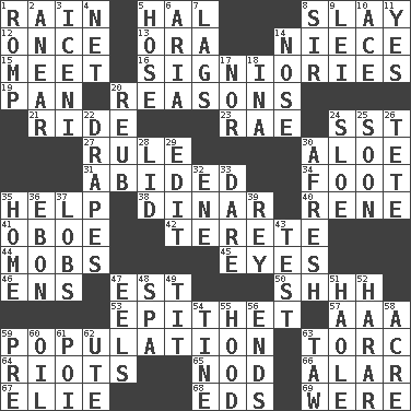 ACROSS 1. Precipitation 5. Actor Linden 8. Kill 12. At one time in the past 13. Mouth or opening 14. Sibling's daughter 15. Rendezvous 16. Seigniories (variant) 19. Baking dish 20. Thinks logically 21. Travel on or in a vehicle 23. Actress Charlotte 24. Fast jet (abbr.) 27. Court order 30. Medicinal plant 31. Stayed 34. Lowest support of a structure 35. Aid 38. Middle Eastern gold or silver currency 40. French philosopher Descartes 41. Mitch Miller's instrument 42. Cylindrical with tapered ends 44. Crowds into 45. Sight organs 46. Followers of ems 47. Eastern Standard Time (abbr.) 50. Quiet! 53. Curse 57. American Automobile Association (abbr.) 59. Census information 63. Torque (variant) 64. Disturbances 65. Allow head to fall sleepily 66. Having or resembling wings 67. Writer Wiesel 68. Begley and Asner 69. We are DOWN 1. Frolic 2. Approach 3. Ancient Celtic tribe of eastern Britain 4. Remaining after all deductions 5. Stockings 6. Operatic vocal solo 7. Falls behind 8. Title for a knight 9. Luau accessory 10. Adept person 11. Affirmative reply 14. Sense of smell 17. And not 18. _ tizzy (2 wds.) 20. Reuben's nickname 22. Window treatments 24. _ gin 25. Within a short period 26. False hair 28. Flaplike covering 29. Prepare for publication 30. Anew 32. Compass dir. 33. Have the gumption 35. Residence 36. Inky black, to poets 37. Tennis shots 39. Marina Del _, California 43. Trial 47. Snakelike fish 48. Health resort 49. Teat (slang) 51. White Person, in Hawaii 52. Ethiopian city, capital of Harari 54. Prong on a fork 55. Parka part 56. Extremities 58. 1/640 square mile 59. Before (prefix) 60. Petroleum 61. Luau course 62. Shoshoni 63. The 23rd letter of the Hebrew alphabet