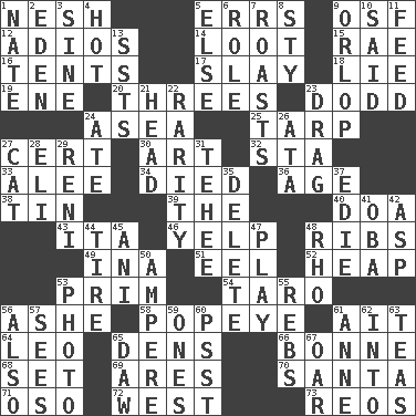 ACROSS 1. Delicate 5. Blunders 9. Order of Saint Francis (abbr.) 12. Goodbye (Sp.) 14. Spoils 15. Actress Charlotte 16. Portable shelters 17. Kill 18. Whopper 19. Compass dir. 20. Threesomes 23. Texas town _ City 24. Toward the sea 25. Canvas cover 27. An absolute certainty 30. Nonscientific branch of learning 32. R.R. building 33. Toward shelter 34. Passed on 36. Personal question 38. Shallow baking pan 39. Definite Article 40. ___ good deed 43. Call ___ day 46. Sharp bark 48. Chest bones 49. _ tizzy (2 wds.) 51. Snakelike fish 52. Pile 53. Demure 54. Edible starchy tuberous root 56. American tennis player Robert 58. Wimpy's pal 61. Small island 64. Lion 65. Habitations of wild animals 66. Child's nurse 68. Put into a specified state 69. Ancient Greek god of war 70. Before Barbara or Clara 71. Bear (Spanish) 72. Compass direction 73. Vintage cars DOWN 1. Nathan's nickname 2. Locale of original sin 3. Trig term 4. Being at a high temperature 5. Otherwise 6. Hero or heavy, e.g. 7. Cooks with dry heat, as in an oven 8. Filthy place 9. Fourth or lowest deck 10. Stated 11. Nourish 13. Fast planes 21. Froth on beer 22. Noteworthy scarcity 23. To trail on the ground 24. Had dinner 26. _ moment's notice (2 wds.) 27. Feline 28. Connecticut Ivy Leaguer 29. Painter Guido (1575-1642) 31. Giggle 35. Erase 37. Singer Brickell 41. Chief or king in Benin or Nigeria 42. Cleo's killer 44. Hoop that covers a wheel 45. Black tropical American cuckoo 47. Frolic 48. 17th letter of the Greek alphabet 50. Electrical Unit 53. Picture 55. Confederate soldiers (slang) 56. In addition 57. Perceives with the eye 59. Singles 60. Inconspicuous attention getter 61. Queen of England 1702-14 62. To the inside or interior of 63. Beverages made from leaves 65. Obsolete 67. Rowing implement