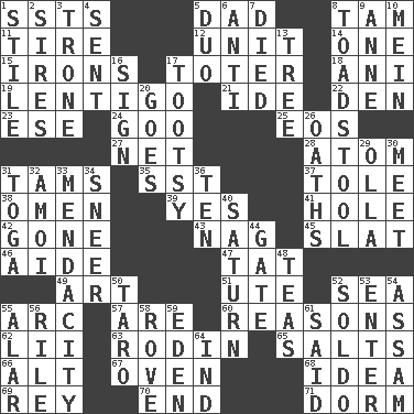 ACROSS 1. Fast planes 5. June honoree 8. Scottish cap 11. Hoop that covers a wheel 12. A single undivided whole 14. Single 15. Metal shackles 17. Carrier 18. Black tropical American cuckoo 19. Small, flat, pigmented spot on the skin 21. Binary compound 22. Lair 23. Compass dir. 24. Thick or sticky substance 25. Greek goddess of the dawn 27. Remaining after all deductions 28. Smallest unit of an element 31. Scottish caps 35. Fast jet (abbr.) 37. Lacquered or enameled metalware 38. Sign of something about to happen 39. Affirmative reply 41. Opening into or through something 42. Went 43. Tired old horse 45. Narrow board 46. Assistant 47. Make lace 49. Tate display 51. Shoshoni 52. Ocean 55. Curve 57. "We ___ not amused" (Victoria) 60. Thinks logically 62. Cards in a Roman deck? 63. "The Thinker" sculptor 65. Table seasonings 66. Keyboard modifier key 67. Baking chamber 68. It may be bright or harebrained 69. Marina Del _, California 70. Conclude 71. Dormintory (informal) DOWN 1. Vertical member of a panel or frame 2. Begets 3. Marketplace scale 4. Posted 5. Superhero pair 6. Against 7. Passed on 8. Inedible or poisonous agaric 9. Queen of England 1702-14 10. Chow _ 13. Relationship diagram 16. Signal 17. A girl or young woman (variant) 20. Moves 26. Profane or obscene expressions 29. Rounded earthenware pot or jar 30. Confront 31. Ancient Roman robe 32. Mine, in Marseilles 33. Ananias' fault 34. Contemptuous expression 36. "___ Little Indians" 40. Titan orbits this 44. Yard entry 48. Afternoon social gatherings 50. Pacific island yam 52. Twentieth part of a lira 53. Keyboard key 54. Indian state 55. Having or resembling wings 56. Cause heat under the collar 58. Be footloose 59. Paradise 61. Stated 64. Working for oneself (abbr.)