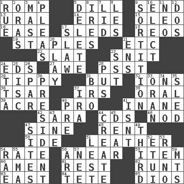 ACROSS 1. Play 5. Deli pickle 9. Transmit 13. Mountain range 14. One of the Great Lakes 15. Margarine 16. Relaxation 17. Bobsleighs 18. Vintage cars 19. Paper fasteners 21. And so on (abbr.) 22. Narrow board 23. In a ____ (agitated or irritated) 24. Begley and Asner 27. Deep reverence 28. Inconspicuous attention getter 29. Likely to tip or tilt 31. Yet 32. Charged particles 36. Russian ruler of old 37. Big collection agency 38. Spoken 39. Measure of real estate 40. Adept person 41. Lacking in sense or substance 42. "Two Mules for Sister ____" 44. Music discs 46. Lower and raise head in agreement 47. Trig term 48. Monthly bill 50. Binary compound 51. Cordwainer's material 54. Assign a rank or rating to 56. Approach 58. A whole individual unit 60. So be it 61. Respite 62. The smallest animal of a litter 63. 90 degrees 64. Wig 65. "Vaya con ____" DOWN 1. Regret 2. Mouths or openings 3. Vertical spar for supporting sails 4. Entreaties 5. Erase 6. Angers 7. Flaplike covering 8. French article 9. Making a chance decision by using lots 10. Opt 11. Modern: prefix 12. Two (Sp.) 17. Cole _ (cabbage dish) 20. Live dramatic performance 21. Followers of ems 23. Fast jet (abbr.) 24. Singer James 25. Plate 26. Coast Guard woman 28. Product of festering 30. Elected leader of a country 31. Sis' sibling 33. Northwest Algerian city 34. Billionth: prefix 35. Downhill vehicle 37. Lyricist Gershwin 40. Before (prefix) 41. Is not 43. A saturated hydrocarbon 44. Cause to be 45. Letter starter 47. Locates 49. One of three equal parts 51. For fear that 52. Needle case 53. Western Nevada city 54. Actress Charlotte 55. Nursemaid (var.) 56. Tate display 57. Born 59. Mountains (abbr.)