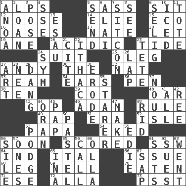 ACROSS 1. High mountains 5. Backtalk 9. Be seated 12. Trap for birds or small mammals 14. Writer Wiesel 15. Environmental prefix 16. Fertile tracts in a desert 17. Nathan's nickname 18. Allow 19. One (Scot) 20. Being or containing an acid 23. Periodic rise and fall of the sea level 24. Costume for a special activity 25. Cassini of fashion 27. Actor Griffith 30. Definite Article 32. Floor covering 33. 480, 500 or 516 sheets of paper 34. Hearing organs 36. Writing instrument 38. "___ Little Indians" 39. Small bed 40. Boat paddle 43. Grand Old Party 46. First of billions? 48. Governing power 49. Strike 51. Epoch 52. Small island 53. Dad 54. Supplemented with great effort 56. Within a short period 58. Tallied 61. Compass dir. 64. Indiana (abbr.) 65. Slanted text style (abbr.) 66. Come out of 68. Part of a journey 69. 1994 drama film starring Jodie Foster 70. Ingested 71. Compass dir. 72. Silent film actress Nazimova 73. Inconspicuous attention getter DOWN 1. Small Philippine buffalo 2. Grant temporary use of 3. Introduce or present, as a question 4. Compass dir. 5. Transmit 6. Mountain range southwest of Kyrgyzstan 7. "Cheers" or "Ellen" 8. Observe 9. Major League Baseball Commissioner Bud 10. On the rocks 11. Lug 13. He sold his birthright 21. Quote 22. New York city 23. False hair 24. Symbol (abbr.) 26. Pet locale 27. Tate display 28. Born 29. Mild oath, euphamism for damn 31. Eat (away) 35. A viewer who gazes fixedly 37. Common sense 41. Everything 42. Portuguese money of account (variant) 44. Northwest Algerian city 45. Infant food 47. Create 48. To free from 50. Soft color 53. Porridge 55. Singer Brickell 56. Filth; sediment 57. Singles 59. Give a ring to 60. Water jar 61. Fast planes 62. Takes to court 63. Gone 65. _ tizzy (2 wds.) 67. Plant excrement