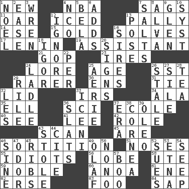 ACROSS 1. ___ Haven, CT 4. Basketball assoc. 7. Sinks 11. Boat paddle 12. On the rocks 13. Chummy 14. Compass dir. 15. Aureate 16. Finds the solution 17. Soviet premier 1918-24 19. Aide 21. Grand Old Party 23. Angers 24. Old wives' tales, e.g. 25. Grow older 26. Fast jet (abbr.) 29. More valued for its uncommonness 30. Followers of ems 31. Neckwear 32. Hat (slang) 33. Big collection agency 34. In the manner of 35. Pipe bend 36. _-fi 37. Learning spot: Fr. 40. Perceive with the eye 41. Area sheltered from the wind 42. Hero or heavy, e.g. 43. Examine minutely or intensely 45. "We ___ not amused" (Victoria) 46. Casting lots 51. Olfactory organs 55. Foolish or stupid persons 56. Ear part 58. Shoshoni 59. Having high moral qualities 60. Small Philippine buffalo 61. Compass dir. 62. Celtic language 63. Egg _ yung 64. Plant excrement DOWN 1. Christmas carol 2. Comfort 3. Songbird 4. Non-commissioned officer (abbr.) 5. Actor Lugosi 6. Sums up 7. Table seasonings 8. Inventor's middle name 9. Small, secluded valley 10. System (abbr.) 12. Refuse to acknowledge 13. Airs 16. Begets 18. Russian composer Stravinsky 20. Omens 22. For each 24. Dipping utensil 25. Nest on high 26. Showing deterioration from age 27. Filth; sediment 28. Beverage made from leaves 29. Cause heat under the collar 32. French article 33. Ancient Celtic tribe of eastern Britain 36. Narrow boards 37. Epoch 38. Pupil covering 39. Butter sub 43. Took without asking 44. Quote 46. Trig term 47. Scent 48. Teases 49. Norwegian king 50. Words to Nanette 52. Institutes legal proceedings 53. Inactive volcano in Sicily 54. Ooze 57. Sometimes accompanies a hiss