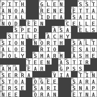 ACROSS 1. Heart or essence 5. Small, secluded valley 9. Fast jet (abbr.) 12. Small Philippine buffalo 13. French philosopher Descartes 14. Singer James 15. Slanted text style (abbr.) 16. It may be bright or harebrained 17. Move on water 18. Lower and raise head in agreement 19. Car or cant ending 21. Cell (Danish) 22. Broke a traffic law 24. White ___ sheet 26. Raised railways 27. Vertical member of a panel or frame 28. Painful 29. The Jewish people; Israel 30. 0 degrees 32. Table seasoning 36. _ vera 37. _ de Janeiro 38. He sold his birthright 39. Many (prefix) 40. Excessive but superficial compliments 42. American tennis player Robert 43. Adolescent 44. Having gotten out of bed 46. Nursemaid (var.) 49. Hearing organ 50. Global Positioning Systems (abbr.) 51. Father Junipero _ 53. By way of 54. Metal container 57. Portico 58. Double curve, resembling the letter S 61. "Two Mules for Sister ____" 62. Celtic language 63. Indian skirt 64. Fastener 65. Born 66. NW Algerian seaport 67. Inactive volcano in Sicily DOWN 1. Ache 2. To the inside or interior of 3. Inedible or poisonous agaric 4. Actor Linden 5. Smile widely 6. Directed 7. Compass dir. 8. Teachers' org. 9. Showing deterioration from age 10. Not moving 11. Lies 14. Compass dir. 19. Snakelike fish 20. Genesis locale 21. Island 23. Abounding in pines 24. Thespian 25. Quiet! 27. Grain storage tower 28. Believer in; advocate of (suffix) 29. Plant excrement 31. Abalone 32. Theater features 33. Helper 34. Cowardly lion portrayer 35. Third day of the wk. 40. Ocean 41. Wise men 43. Afternoon social gathering 45. Health resort 46. NE Netherlands city 47. Distance measurement (Brit.) 48. Came up 52. Actress Charlotte 53. Distinctive style or manner 55. SW Asia republic 56. California wine valley 58. Bear (Spanish) 59. Slender fish 60. Epoch 61. Compass dir.