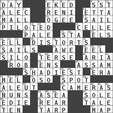 ACROSS 1. 24 hours 4. Supplemented with great effort 8. Fast jet (abbr.) 11. Actor Baldwin 13. Painter Guido (1575-1642) 14. Singer James 15. Shopping center 16. Double curve, resembling the letter S 17. Move on water 18. Manned the helm 21. Cell (Danish) 22. Light colored 23. R.R. building 25. Raised railways 26. Pipe bend 29. What propaganda does 32. Travels by water 34. Deep reverence 35. Snakelike fish 38. Grain storage tower 39. Laconic 41. Roberta Peters solo 43. Director Reiner 44. Followers of ems 45. Indian state 46. Most questionable 50. Period 51. Cartoonist voice _ Blanc 54. Bear (Spanish) 55. Blemish 57. Eskimo relative 59. Devices for capturing images 63. Religious women 64. Toward the sea 67. Flatfish 68. Singer Brickell 69. Located in or toward the back 70. Falsehood 71. "___ Little Indians" 72. Canvas cover 73. Atlas unit DOWN 1. Moist 2. Mountain range southwest of Kyrgyzstan 3. Shout 4. Eats (away) 5. Barrel 6. Compass dir. 7. Pass on 8. Lacking originality or spontaneity 9. Not moving 10. Lies 12. Hoof sound 14. Compass dir. 19. Small boys 20. Biblical high priest 21. Domesticated feline 23. Sty mamas 24. Relationship diagram 26. Curvy letter 27. Den 28. _ and Stitch 30. Tarsus (plural) 31. Oceans 33. Tennis shots 36. Celtic language 37. One who doesn't tell the truth 39. Beverages made from leaves 40. Inside; within (prefix) 42. Nanny (var.) 45. Smallest unit of an element 47. Being at a high temperature 48. Fortification 49. Health resort 51. French painter Edouard 52. Evade 53. Soviet premier 1918-24 56. Trial 58. Purpose 60. Wander 61. Silent film actress Nazimova 62. Ooze 64. Nonscientific branch of learning 65. Ocean 66. Hearing organ