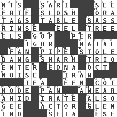 ACROSS 1. Mountains (abbr.) 4. Indian skirt 8. Perceive with the eye 11. One of the Great Lakes 13. Make a splashing sound 15. Mouth or opening 16. Labels 17. Eating place 18. Backtalk 19. Wash lightly 21. Snakelike fish 22. Woody plant 23. Raised railways 24. Republican Party 27. For each 29. Composer Stravinsky 30. Brizilian seaport 34. Air blower 36. Corncob 39. Took without asking 40. Mild oath, euphamism for damn 41. Excessive but superficial compliments 43. Musical group of three 44. Keyboard key 46. Pulitzer Prize-winning author Ferber 47. Sep. follower 48. Annoying sound 49. SW Asia republic 51. Beverage made from leaves 53. Car or cant ending 54. Small bed 57. Method 60. Baking dish 63. Approach 65. Among 66. Feeling or showing extreme anger 69. In addition 70. Unit of force equal to gravity 71. Thespian 72. Small, secluded valley 73. Working for oneself (abbr.) 74. Stalk of a moss capsule 75. Compass dir. DOWN 1. Distance measurement (Brit.) 2. Get behind 3. Public displays of written messages 4. Fast jet (abbr.) 5. In the manner of 6. Loose flowing garment 7. Capri or Wight 8. Fly high 9. Celtic language 10. Comfort 12. Curvy letter 14. Assist 18. Ski resort town in Vermont 20. Ovum 25. I made a mistake 26. First class 28. Followers of ems 29. Swallowed 31. Torque (variant) 32. Set down 33. Lion 34. Papal veil 35. Opposed to 37. Groovy apt. 38. Bert's buddy 40. Lair 42. Female horse 45. Portuguese money of account (variant) 50. Santa ___, CA 52. Capital of Western Samoa 54. Cell (Danish) 55. Fertile tracts in a desert 56. Marketplace scale 57. Wise men 58. Presage 59. Passed on 61. Curves 62. Nathan's nickname 64. Tired old horse 67. Small child 68. Period