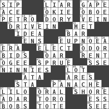 ACROSS 1. Small drink 4. One who doesn't tell the truth 8. Yawn 12. Adept person 13. Migrant worker of the '30s 14. Mitch Miller's instrument 15. Stone: prefix 18. Dinghy 19. Distinctive style or manner 20. Popular '50s hangout 22. Was introduced to 23. The content of cognition 24. Oblong piece of solid material 25. Followers of ems 26. Normal relaxed breathing 30. Period 33. Choose 36. Aroma 37. Auction offers 39. Boat paddle 40. Monthly bill 41. Double curve, resembling the letter S 42. Upset 44. Compass dir. 45. Fools 47. Car dealer's back yard 50. _ moment's notice (2 wds.) 51. Ancient Greek god of war 53. R.R. building 54. Flamboyance 57. _ and Stitch 59. Spoken 61. Dinah or Pauly 63. The sixth month of the Jewish calendar 64. "Corrida" creature 65. Curvy letter 66. Moves up and down 67. Carryall 68. Perceive with the eye DOWN 1. Plant excrement 2. On the rocks 3. _ dish (used to culture cells) 4. Farming town in central California 5. Image 6. Atmosphere 7. Marina Del _, California 8. State head 9. Collude with 10. Luau course 11. Car or cant ending 16. Travel on an animal 17. Baking chamber 21. Comfort 22. Atlas unit 24. On the contrary 26. Shade of tan 27. Lyric poems 28. Immeasurably long periods of time 29. Johnson of "Laugh-In" 30. Inky black, to poets 31. Swiss mountan, "Queen of the Mountains" 32. Arabian gulf 34. Chops off 35. Ewer handle 38. Legislators 42. Ocean 43. Liveliness 46. Call ___ day 48. Mouths or openings 49. Technical 52. Imelda's hoard 53. Thick slice 54. Role in a play 55. Medicinal plant 56. Celtic language 57. Experiment locale 58. Wedding promise 59. Baseball player Mel 60. Friend of Pooh 62. Compass dir.