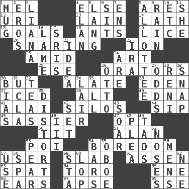 ACROSS 1. Cartoonist voice _ Blanc 4. Otherwise 8. Ancient Greek god of war 12. RI univ. 13. (Had) reclined 14. Thin strip of wood or metal 15. Purposes of endeavors 18. Pismires 19. Louse (plural) 20. Catching in a trap 22. Electrically charged atom 23. Among 24. Tate display 25. Compass dir. 26. Speakers 30. With the exception that 33. Having winglike extensions 36. Genesis locale 37. On the rocks 39. The first octave above the treble staff 40. Pulitzer Prize-winning author Ferber 41. Jai ____ 42. Grain storage towers 44. Small drink 45. More lively and spirited 47. Choose 50. Teat (slang) 51. Actor Alda or Thicke 53. Luau course 54. Mood resulting from idleness 57. One who uses or employs something 59. Thick slice 61. NE Netherlands city 63. Petty quarrel 64. "Corrida" creature 65. Compass dir. 66. Hearing organs 67. Domed church section 68. Compass dir. DOWN 1. Java container 2. Greek god of love 3. Climbing, woody, usually tropical vines 4. Liveliness 5. Long (Scottish) 6. Be seated 7. Followers of ems 8. One to whom something is allotted 9. Precipitation 10. And so on (abbr.) 11. A female animal or person 16. Unable to walk 17. Indian titles of respect 21. The main thing one is thinking about 22. Lyricist Gershwin 24. "We ___ not amused" (Victoria) 26. Von Bismarck 27. Probability 28. Painter Guido (1575-1642) 29. Fastener 30. Prejudice 31. Southern CA. univ. 32. Afternoon social gatherings 34. Den 35. Everything 38. What propaganda does 42. Put into a specified state 43. Fly high 46. One more than two 48. Entreaty 49. Small amounts or degrees 52. Olfactory organs 53. Lightbulb-shaped fruit 54. Long, evenly shaped pieces 55. Mitch Miller's instrument 56. Not women's 57. Purpose 58. Health resort 59. R.R. building 60. Trim (branches) 62. Born