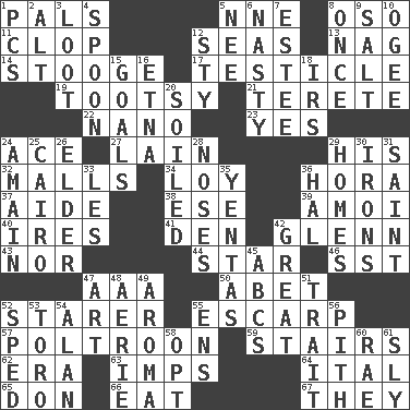 ACROSS 1. Friends 5. Compass dir. 8. Bear (Spanish) 11. Hoof sound 12. Oceans 13. Tired old horse 14. Moe Howard, for one 17. One of the two male reproductive glands 19. Tootsie (variant) 21. Cigar-shaped 22. Billionth: prefix 23. It is so 24. Adept person 27. (Had) reclined 29. Part of HMS, perhaps 32. Shopping centers 34. Myrna of the movies 36. Israeli folk dance 37. Assistant 38. Compass dir. 39. Mine, in Marseilles 40. Angers 41. Lair 42. American astronaut and politician John 43. And not 44. Play the lead 46. Fast jet (abbr.) 47. Auto club (abbr.) 50. Collude with 52. A viewer who gazes fixedly 55. Fortification 57. Coward 59. Flight of steps 62. Period 63. Naughty children 64. Slanted text style (abbr.) 65. Spanish title 66. Ingest 67. Those people DOWN 1. Personal Computers (abbr.) 2. Keyboard modifier key 3. Plunder 4. Soup utensil 5. Born 6. Offensive 7. First name in cosmetics 8. At one time in the past 9. Table seasoning 10. Double curve, resembling the letter S 12. Filthy place 15. Scores awarded for successful feats 16. Inactive volcano in Sicily 18. Big collection agency 20. Dirtied 24. With great haste 25. Capital of Egypt 26. A person who is older than you are 28. Olfactory organs 29. Residences 30. Removes the wrinkles 31. Virtuous person 33. French article 35. Gossips 36. Actor Linden 42. Relatively large 45. Lettered men learn these first 47. Tate display 48. Nest on high 49. Odor 51. Distinguishing feature 52. Moved rapidly 53. "Corrida" creature 54. Actor Alda or Thicke 55. Followers of ems 56. Essential or central part 58. Choose 60. Actress Charlotte 61. Playfully artful