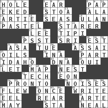 ACROSS 1. Opening into or through something 5. Ewer handle 8. Infant food 11. Supplemented with great effort 12. Portico 14. In the manner of 15. Nick name for Arthur 17. Oceans 18. ____ Bator 19. Soft color 21. A viewer who gazes fixedly 23. Area sheltered from the wind 25. Native american tent (variation) 26. Inconspicuous attention getter 27. _ Lanka 28. Eastern Standard Time (abbr.) 31. White ___ sheet 33. Third day of the wk. 35. Slender Brazilian palm 37. Lubricates 38. _ tizzy (2 wds.) 40. Component 41. Potato state 43. Heredity factor (abbr.) 45. Fr. "Yes" 46. Allow 47. Atlas unit 50. Egg locale 52. Technical work 53. A really long time 54. Right away 56. Annoying sounds 61. Soared 62. At one time in the past 65. Compose 66. Snakelike fish 67. Tail end 68. Johnson of "Laugh-In" 69. Fifth month 70. R.R. building 71. Actress Patricia DOWN 1. Pile 2. Gumbo ingredient 3. Allows 4. Prepare for publication 5. Double-curved letter 6. Had dinner 7. Cooks with dry heat, as in an oven 8. Diluted with white 9. Having or resembling wings 10. Baking dish 13. Having gotten out of bed 16. Snakelike fish 18. RI univ. 20. For fear that 22. Capital of Western Samoa 24. Needle case 26. Romantic infatuation 28. Son of Isaac 29. Indian skirt 30. Teat (slang) 31. Assistant 32. Narrow board 34. Conclude 36. Specific locale 37. Lubricate 39. Queen of England 1702-14 42. Sign of things to come 44. A really long time 48. Thespian 49. Gives a jingle 51. Overwhelm 52. Pull behind 54. Entreaty 55. Trust 57. SW Asia republic 58. The founder of a family 59. Singer James 60. Stitch closed the eyes of (a falcon) 61. Opposite of masc. 63. Domesticated feline 64. Period