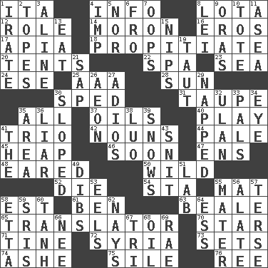ACROSS 1. Call ___ day 4. A message received and understood 8. Globular water bottle used in Asia 12. Hero or heavy, e.g. 14. Person of subnormal intelligence 16. Greek god of love 17. Capital of Western Samoa 18. Conciliate 20. Portable shelters 22. Health resort 23. Ocean 24. Compass dir. 25. Auto club (abbr.) 28. Player for Phoenix 30. Drove too fast 31. Grayish beige 35. Everything 37. Lubricates 40. Live dramatic performance 41. Musical group of three 42. Parts of speech 44. Diluted with white 45. Pile 46. Within a short period 47. Followers of ems 48. Having ears or earlike features 50. Uncontrolled 52. Pass on 54. R.R. building 55. Floor covering 58. Eastern Standard Time (abbr.) 61. Benjamin's nick name 63. Memphis, Tenn. Street 65. Interpreter 70. Play the lead 71. Prong on a fork 72. Damascus' land 73. Arranges properly for use 74. American tennis player Robert 75. Drop; flow; fall 76. To sift DOWN 1. Feeling or showing extreme anger 2. Drinks excessively 3. Place in a line 4. Mischievous child 5. Not either 6. From 7. I made a mistake 8. Luau accessory 9. Mouths or openings 10. Lug 11. At sea 13. Consume 15. Cuts off 19. Tense 21. Plant excrement 26. Period of immesurable duration 27. Goodbye (Sp.) 29. Slept 30. Had an oblique or slanted direction 32. Uhlan (variant) 33. Friends 34. Sight organ 35. Length times width 36. One who doesn't tell the truth 38. Nilotic language 39. Overwhelms 41. Definite Article 43. In a ____ (agitated or irritated) 49. Rights 51. Experiment locale 53. Snakelike fish 55. Mother 56. Having winglike extensions 57. Laconic 58. Singer James 59. Indian titles of respect 60. Hyperbolic tangent 62. Negative votes 64. Double-curved letter 66. Born 67. Three (prefix) 68. Lubricate 69. Actress Charlotte