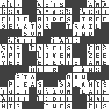 ACROSS 1. Wind 4. Soaks 8. Santa ___, CA 11. Girls' org. (abbr.) 12. Collect or gather 14. Highlander 15. Writer Wiesel 17. Amusement-park features 18. Woody plant 19. Legislator 21. Hang back 23. Boy, to dad 24. Working for oneself (abbr.) 25. Highlander 27. Put down 30. Plant excrement 31. Artist's stands 34. Music discs 37. Fitting 38. Make or become more lively 39. Last letter of the English alphabet 40. Affirmative reply 41. Chooses 43. One (Scot) 44. Fermented drink made from hops 45. Hearing organs 47. Parent Teacher Association (abbr.) 49. Daniel's nick name 50. Entreaties 52. Deli grouping 56. A blast of a horn 57. The state of being joined or united 60. Thin strip of wood or metal 61. Johnson of "Laugh-In" 62. Learning spot: Fr. 63. Actress Charlotte 64. Mountains (abbr.) 65. Washington bills 66. Raised railways DOWN 1. Matures 2. Capri or Wight 3. Water falling in drops from the sky 4. Make _____ (do battle with) 5. Arab leader 6. Bit 7. Compass dir. 8. Sour-tasting 9. Christmas carol 10. Had dinner 13. Fast jet (abbr.) 14. Comedian Laurel of Laurel & Hardy 16. Relaxation 20. Lacquered or enameled metalware 22. To free from 25. Yawn 26. Tenement units (abbr.) 27. Prying instrument 28. Actor Baldwin 29. Is not 30. Declare 32. Toward shelter 33. Filth; sediment 34. Russian ruler of old 35. Cub Scout units 36. Perceive with the eye 42. Lick closed 44. Sound made by sheep 46. Of or related to the anus 47. Small pieces of grounds 48. False hair 49. Natives or inhabitants of Denmark 50. Sweet dark-red dessert wine 51. Take to court 52. Not divided or shared with others 53. Female horse 54. Slanted text style (abbr.) 55. "______ My Girl" (Turtles hit) 56. Scottish cap 58. Non-commissioned officer (abbr.) 59. Electrically charged atom