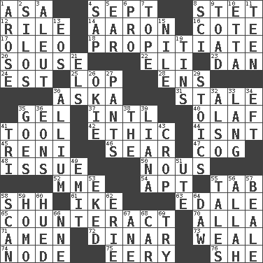 ACROSS 1. White ___ sheet 4. Back-to-school mo. 8. Proofreading order 12. Cause heat under the collar 14. Composer Copland 16. ____ d'Azur (French Riviera) 17. Butter sub 18. Appease 20. Lush 22. Connecticut Ivy Leaguer 23. One of the 12 tribes of Israel 24. Eastern Standard Time (abbr.) 25. Trim (branches) 28. Followers of ems 30. "____ silly question..." 31. Showing deterioration from age 35. Set 37. International (abbr.) 40. Norwegian king 41. Instrument 42. Principle of right and wrong 44. Is not 45. Painter Guido (1575-1642) 46. Burn superficially 47. Gear tooth 48. Come out of 50. Horse sense 52. Madame (abbr.) 54. Fitting 55. Bar bill 58. Quiet! 61. Eisenhower's nickname 63. Peak District village in England 65. Neutralize 70. Silent film actress Nazimova 71. So be it 72. Middle Eastern gold or silver currency 73. Welt 74. Thickened enlargement 75. Suggestive of the supernatural 76. A female animal or person DOWN 1. Came up 2. Grain storage towers 3. Native American of Southwest Alaska 4. Plant excrement 5. Ewer handle 6. Adept person 7. Drink excessively 8. _-fi 9. Frog relative 10. Singer James 11. Adolescent 13. Greek goddess of the dawn 15. "Death on the ____" 19. Metal containers 21. Raised railways 26. Migrant worker of the '30s 27. Leg coverings 29. Unemotional ones 30. Plant genus of onion and garlic 32. In addition 33. Long (Scottish) 34. Lizard (obsolete) 35. Leaves 36. Immeasurably long periods of time 38. Definite Article 39. Woody, climbing, usually tropical plant 41. Three (prefix) 43. Riding implement 49. Give off 51. Shoshoni 53. Supplemented with great effort 55. Stories 56. Assad's deity 57. Calif. Air Force Base 58. Examine minutely or intensely 59. Same (prefix) 60. Took on color 62. One of the Great Lakes 64. Simpleton 66. Compass dir. 67. A saturated hydrocarbon 68. 4-wheeled motor vehicle 69. Attempt to accomplish something