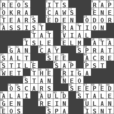 ACROSS 1. Vintage cars 5. It is 8. Strike 11. Gumbo ingredient 12. Crow sounds 14. Compass dir. 15. Pulls apart 17. Genesis locale 18. Scent 19. Help 21. Food allowance for one day 23. Make lace 25. Small bottle 26. Capri or Wight 27. Shade tree 28. _ moment's notice (2 wds.) 31. Separate the seeds from cotton 33. Island 35. Small fatty European fish 37. Table seasoning 38. Observe 40. Measure of real estate 41. Vertical member of a panel or frame 43. Plant excrement 45. Pacific Standard Time (abbr.) 46. Soggy 47. Definite Article 50. Capital of Latvia 52. Comedian Laurel of Laurel & Hardy 53. Modern: prefix 54. Motion picture awards 56. Oozed 61. Jai ____ 62. Old (Scot.) 65. Having lost freshness 66. Commissioned military rank (abbr.) 67. It's straight from the horse's mouth 68. ____ Bator 69. Greek goddess of the dawn 70. Health resort 71. Is not DOWN 1. Roll call or roster of names 2. Makes supply last 3. Mouths or openings 4. Indian skirt 5. Frozen water 6. Small boy 7. Turn aside suddenly 8. Redecorate 9. At once, immediately (arch.) 10. For each 13. Slow-paced one 16. Fast planes 18. Lubricate 20. Baby powder 22. Scottish caps 24. Afternoon social gatherings 26. International (abbr.) 28. Arches 29. Small pie 30. Had dinner 31. Yard entry 32. Came down and settled, as after flight 34. Consenting reply 36. Dad 37. Compass dir. 39. Merit 42. Singer James 44. Sliced desserts 48. Ethiopian city, capital of Harari 49. Follows as a consequence or result 51. Moves 52. _-fi 54. Butter sub 55. Without 57. Needle holder 58. Friends 59. Liveliness 60. Gouge 61. Personal question 63. Mouth edge 64. Heredity factor (abbr.)