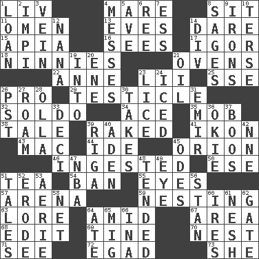ACROSS 1. 54 in ancient Rome 4. Female horse 8. Be seated 11. Sign of things to come 13. Nights before holidays 14. Have the gumption 15. Capital of Western Samoa 16. Perceives with the eye 17. Russian composer Stravinsky 18. Fools 21. Baking chambers 22. Queen of England 1702-14 23. Cards in a Roman deck? 25. Compass dir. 26. Adept person 29. A testis 32. Twentieth part of a lira 34. Adept person 35. Disorderly crowd 38. Falsehood 39. Moved through 41. Visual representation of an object 43. Big _ 44. Binary compound 45. Greek mythologigal hunter 46. Consumed 50. Compass dir. 51. Afternoon social gathering 54. Forbid 55. Snake ____ (dice throw) 57. Sports stadium 59. Nestling 63. Old wives' tales, e.g. 64. Among 67. Length times width 68. Prepare for publication 69. Prong on a fork 70. Egg locale 71. Perceive with the eye 72. Mild oath 73. A female animal or person DOWN 1. Grant temporary use of 2. Body of Kaffir warriors 3. Distinctive style or manner 4. Makes clutter 5. "___ Maria" 6. To separate or throw off 7. Curvy letter 8. Gurus 9. Removes the wrinkles 10. Laconic 12. Grandmother 14. HTML Container Element 19. To the inside or interior of 20. Compass dir. 21. Lubricate 23. Louse (plural) 24. On the rocks 26. Pacific Standard Time (abbr.) 27. Wander 28. Spanish pot 30. Receives possession of 31. Arab leader 33. Tenth: prefix 36. Migrant worker of the '30s 37. Expressions of contempt or scorn 39. Capital of Latvia 40. Arabian gulf 42. Compass dir. 45. Lyric poems 47. Basketball assoc. 48. Watched over 49. Sight organ 51. Stories 52. Wear away 53. Nest on high 56. Comedian Laurel of Laurel & Hardy 58. Remaining after all deductions 60. Angers 61. Delicate 62. Yard entry 64. Had dinner 65. Russian fighter aircraft 66. _ tizzy (2 wds.)