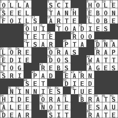 ACROSS 1. Water jar 5. _-fi 8. Hollow 12. Stitch closed the eyes of (a falcon) 13. Hyperbolic tangent 15. Inky black, to poets 16. Fencing necessities 18. Johnson of "Laugh-In" 19. Ear part 20. Fr. "Yes" 22. Sycophants 24. Wig 26. Friend of Pooh 27. Russian ruler of old 28. Parent Teacher Association (abbr.) 29. Heredity factor (abbr.) 32. Old wives' tales, e.g. 35. Mouths or openings 37. Reproach for some lapse or misdeed 38. Singer Brickell 39. Two (Sp.) 40. Electrical Unit 41. Coat; cloak 42. Confederate soldiers (slang) 43. Grows older 44. Indian title of respect (Mr.) 45. Groovy apt. 46. Merit 49. Put into a specified state 50. Passed on 51. Fools 55. Third day of the wk. 56. Flintstone garb 57. Spoken 59. Naughty children 63. Toward shelter 64. Brief written record 65. Son of Isaac 66. Letter starter 67. Be seated 68. Assign a rank or rating to DOWN 1. Order of Saint Francis (abbr.) 2. Lion 3. Flowery wreath 4. One to whom something is allotted 5. R.R. building 6. Draw slowly or heavily 7. To the inside or interior of 8. Sun: prefix 9. Mitch Miller's instrument 10. Tennis shots 11. Compass dir. 14. Centers 17. Takes to court 21. Call ___ day 23. ___ good deed 25. Worn away 28. Went by 29. To be drawn or hauled along 30. Nathan's nickname 31. Tenement units (abbr.) 32. Allows 33. Aroma 34. Swiss mountan, "Queen of the Mountains" 36. Director Reiner 40. Roamer 42. Food allowance for one day 45. Fenced enclosure 47. Small island 48. Reuben's nickname 49. Scornful expression 51. "Death on the ____" 52. The main thing one is thinking about 53. Greek god of love 54. Suttee (variant) 56. Possessed 58. Allow 60. White ___ sheet 61. Make lace 62. Take to court