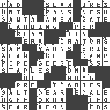 ACROSS 1. Groovy apt. 4. Cole _ (cabbage dish) 8. Angers 12. Corn or form start 13. Baking dishes 14. Delicate 15. Before Barbara or Clara 18. Afresh 19. Yard entry 20. Preparing or cooking with lard 22. For each 23. 480, 500 or 516 sheets of paper 24. ___ a Wonderful Life 25. Epoch 26. Speakers 30. Plant excrement 33. Tall tales 36. 4th largest of the Great Lakes 37. Having or resembling wings 39. Turn to the right 40. Moist 41. Corncob 42. Honkers 44. Fast jet (abbr.) 45. Paper fasteners 47. Heredity factor (abbr.) 50. Petroleum 51. Unfeeling 53. Before (prefix) 54. Sycophants 57. Table seasoning 59. Letter starter 61. Peak District village in England 63. Double curve, resembling the letter S 64. Gumbo ingredient 65. Lion 66. Singe 67. Period of immesurable duration 68. Begley and Asner DOWN 1. Fluid product of inflammation 2. Of or related to the anus 3. Middle Eastern gold or silver currency 4. Connect, as a bridge 5. Long (Scottish) 6. A saturated hydrocarbon 7. Compass dir. 8. Swallowed 9. Bring up, as a child 10. Eastern Standard Time (abbr.) 11. A female animal or person 16. Relationship diagram 17. The sixth month of the Jewish calendar 21. "If ____ say so..." 22. Parent Teacher Association (abbr.) 24. Big collection agency 26. Singles 27. Mouths or openings 28. Basketball hoops 29. Back-to-school mo. 30. Plant excrements 31. Set down 32. Dad 34. Eras 35. To riddle 38. News announcer 42. Set 43. Pulitzer Prize-winning author Ferber 46. Untruth 48. Naked 49. Among 52. Memphis, Tenn. Street 53. Entreaty 54. Edible starchy tuberous root 55. NW Algerian seaport 56. Downhill vehicle 57. Mayday 58. Grow older 59. ___ good deed 60. Supplement with great effort 62. Greek goddess of the dawn